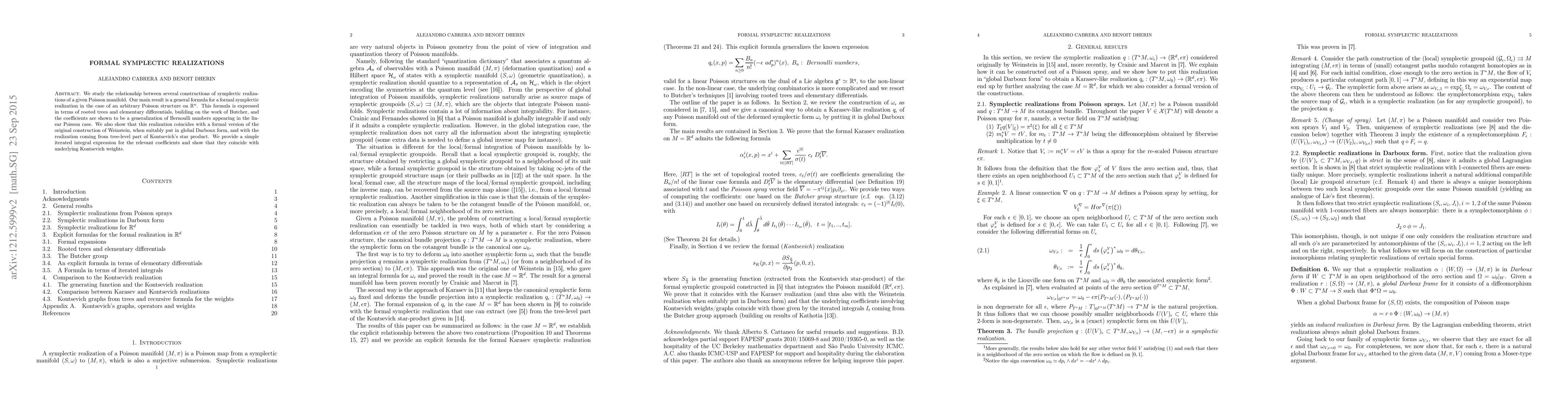 We study the relationship between several constructions of symplectic realizations of a given Poisson manifold. Our main result is a general formula for a formal symplectic realization in the case of an arbitrary Poisson structure on $\R^n$. This formula is expressed in terms of rooted trees and elementary differentials, building on the work of Butcher, and the coefficients are shown to be a generalization of Bernoulli numbers appearing in the linear Poisson case. We also show that this realization coincides with a formal version of the original construction of Weinstein, when suitably put in global Darboux form, and with the realization coming from tree-level part of Kontsevich's star product. We provide a simple iterated integral expression for the relevant coefficients and show that they coincide with underlying Kontsevich weights.