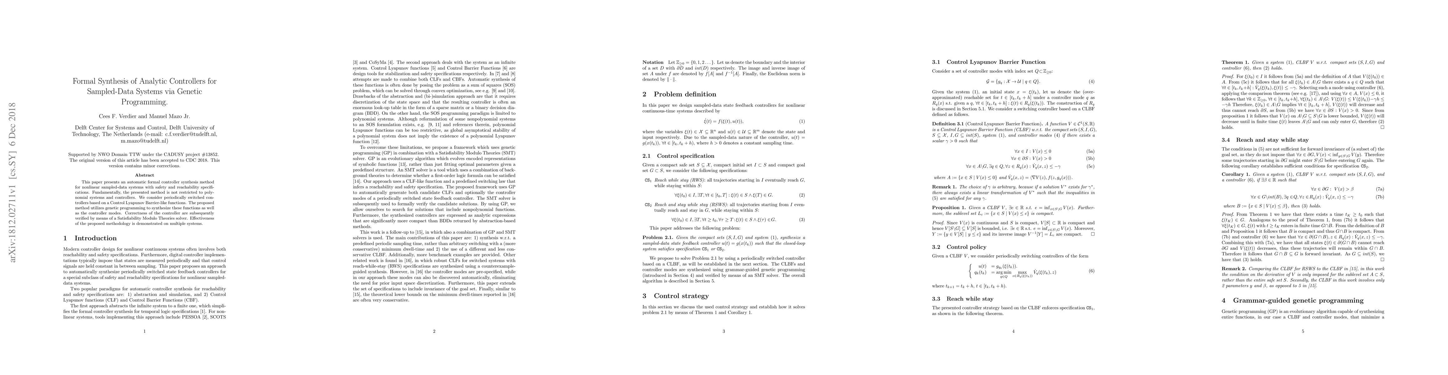 This paper introduces a genetic programming-based method for automatically synthesizing controllers for nonlinear sampled-data systems, utilizing Control Lyapunov Barrier-like functions and verifying correctness via Satisfiability Modulo Theories. The approach is demonstrated on various systems to show its effectiveness.