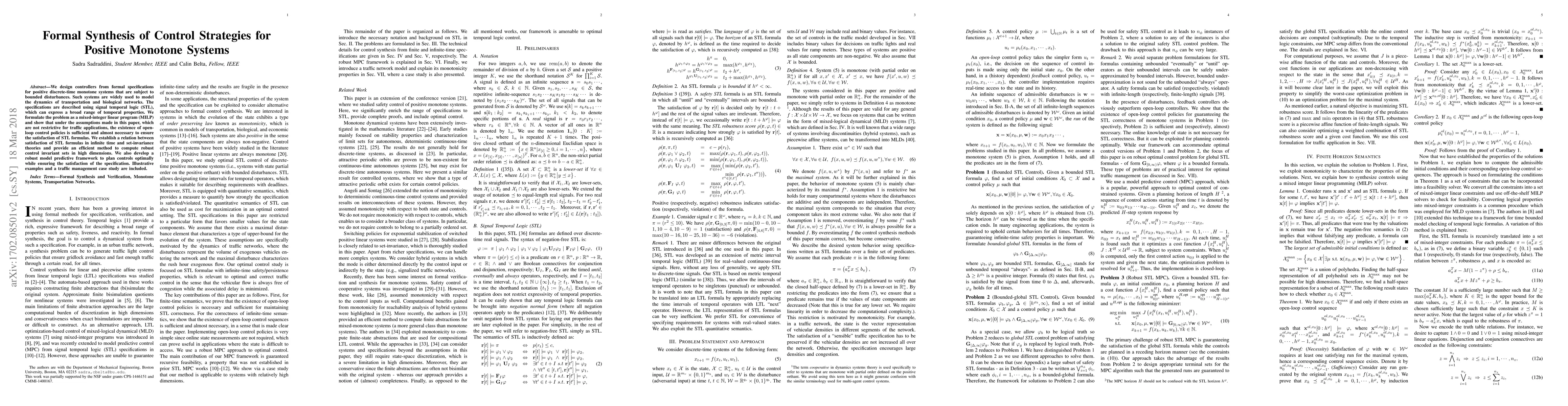 We design controllers from formal specifications for positive discrete-time monotone systems that are subject to bounded disturbances. Such systems are widely used to model the dynamics of transportation and biological networks. The specifications are described using signal temporal logic (STL), which can express a broad range of temporal properties. We formulate the problem as a mixed-integer linear program (MILP) and show that under the assumptions made in this paper, which are not restrictive for traffic applications, the existence of open-loop control policies is sufficient and almost necessary to ensure the satisfaction of STL formulas. We establish a relation between satisfaction of STL formulas in infinite time and set-invariance theories and provide an efficient method to compute robust control invariant sets in high dimensions. We also develop a robust model predictive framework to plan controls optimally while ensuring the satisfaction of the specification. Illustrative examples and a traffic management case study are included.