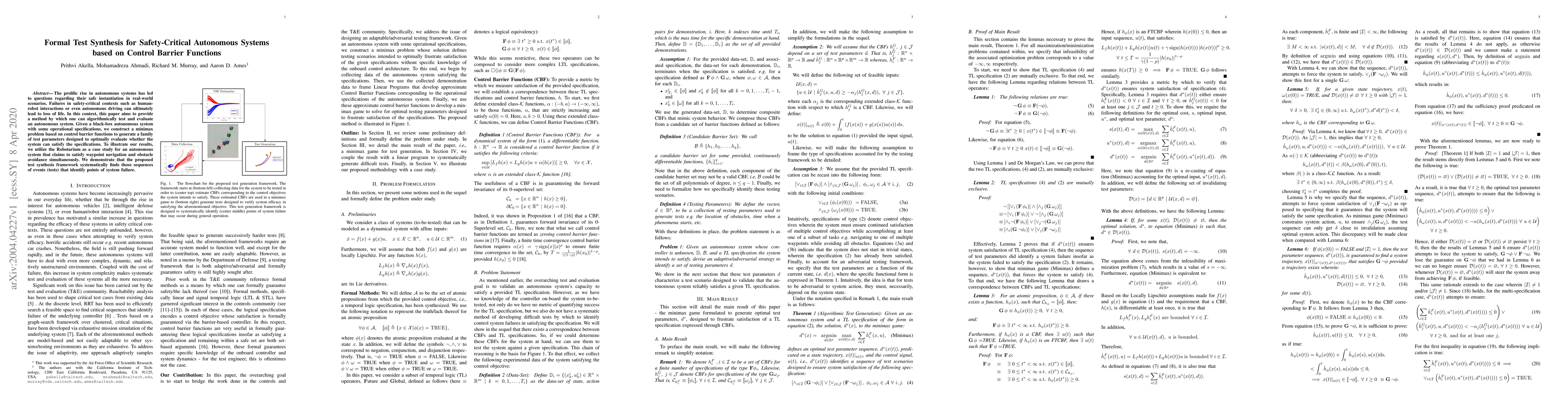 This paper proposes a method for formally testing safety-critical autonomous systems using control barrier functions to generate test parameters that evaluate system compliance with operational specifications. The Robotarium is used as a case study to demonstrate the framework's ability to identify system failure points.