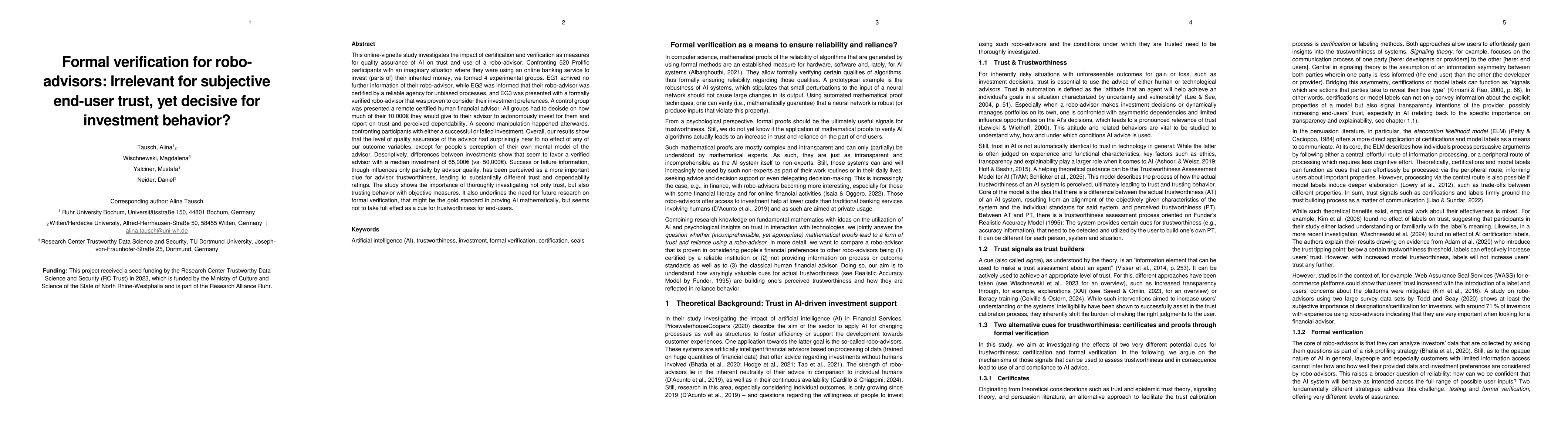 This online-vignette study investigates the impact of certification and verification as measures for quality assurance of AI on trust and use of a robo-advisor. Confronting 520 participants with an imaginary situation where they were using an online banking service to invest their inherited money, we formed 4 experimental groups. EG1 achieved no further information of their robo-advisor, while EG2 was informed that their robo-advisor was certified by a reliable agency for unbiased processes, and EG3 was presented with a formally verified robo-advisor that was proven to consider their investment preferences. A control group was presented a remote certified human financial advisor. All groups had to decide on how much of their 10,000 euros they would give to their advisor to autonomously invest for them and report on trust and perceived dependability. A second manipulation happened afterwards, confronting participants with either a successful or failed investment. Overall, our results show that the level of quality assurance of the advisor had surprisingly near to no effect of any of our outcome variables, except for people's perception of their own mental model of the advisor. Descriptively, differences between investments show that seem to favor a verified advisor with a median investment of 65,000 euros (vs. 50,000). Success or failure information, though influences only partially by advisor quality, has been perceived as a more important clue for advisor trustworthiness, leading to substantially different trust and dependability ratings. The study shows the importance of thoroughly investigating not only trust, but also trusting behavior with objective measures. It also underlines the need for future research on formal verification, that might be the gold standard in proving AI mathematically, but seems not to take full effect as a cue for trustworthiness for end-users.