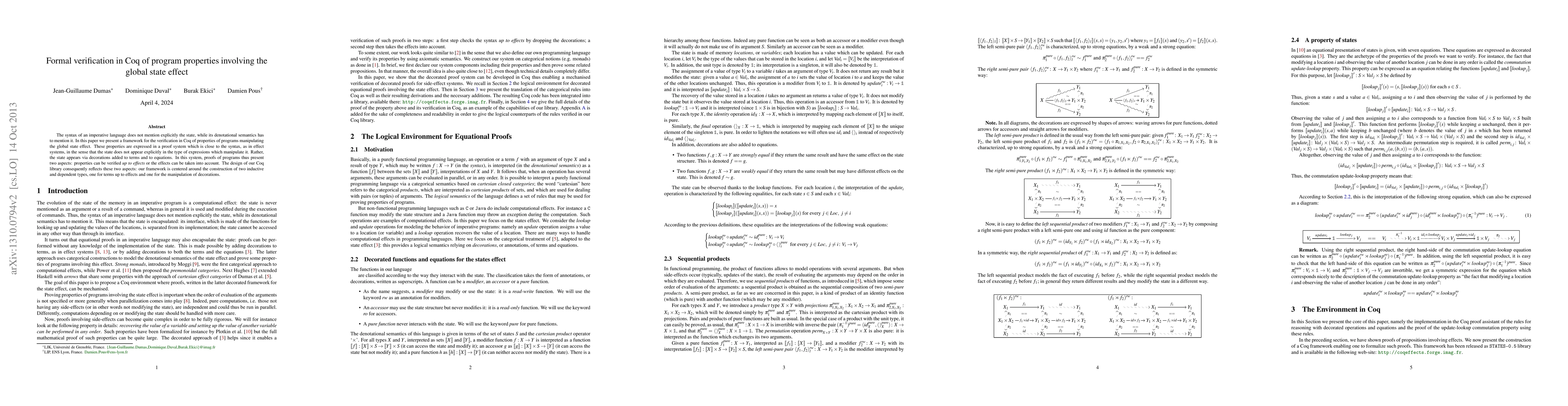 Researchers present a framework in Coq for verifying properties of programs that manipulate global state effects. Their approach allows for verification up to effects or accounting for the effects themselves.