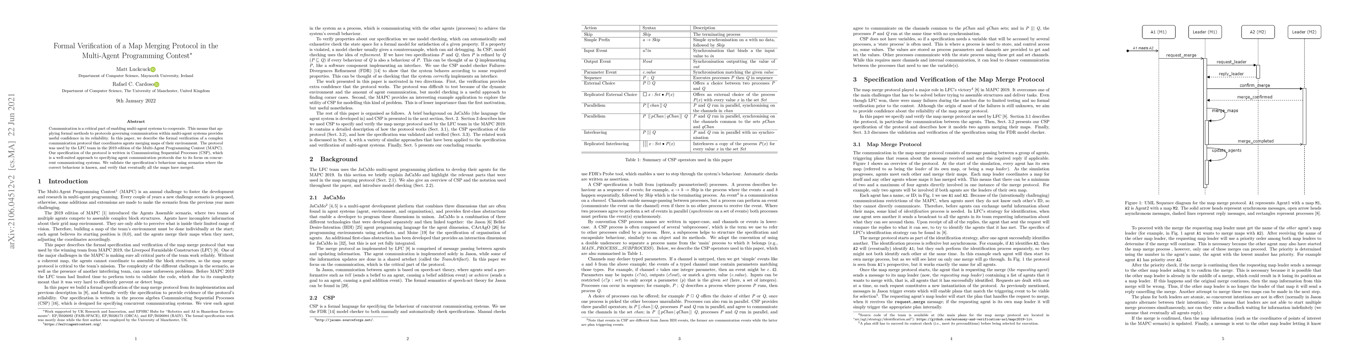 Communication is a critical part of enabling multi-agent systems to cooperate. This means that applying formal methods to protocols governing communication within multi-agent systems provides useful confidence in its reliability. In this paper, we describe the formal verification of a complex communication protocol that coordinates agents merging maps of their environment. The protocol was used by the LFC team in the 2019 edition of the Multi-Agent Programming Contest (MAPC). Our specification of the protocol is written in Communicating Sequential Processes (CSP), which is a well-suited approach to specifying agent communication protocols due to its focus on concurrent communicating systems. We validate the specification's behaviour using scenarios where the correct behaviour is known, and verify that eventually all the maps have merged.