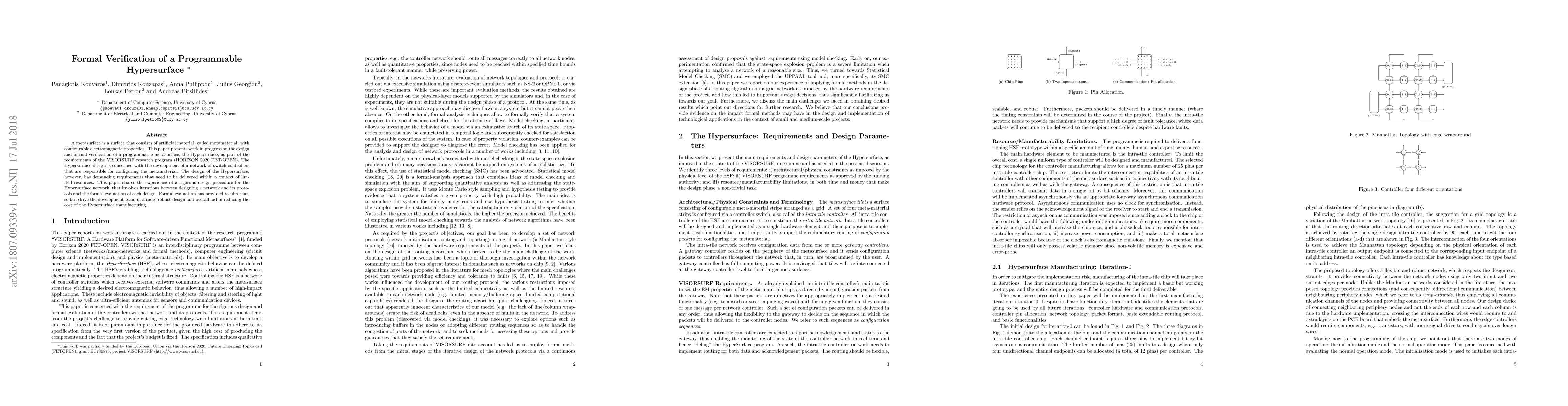 A metasurface is a surface that consists of artificial material, called metamaterial, with configurable electromagnetic properties. This paper presents work in progress on the design and formal verification of a programmable metasurface, the Hypersurface, as part of the requirements of the VISORSURF research program (HORIZON 2020 FET-OPEN). The Hypersurface design is concerned with the development of a network of switch controllers that are responsible for configuring the metamaterial. The design of the Hypersurface, however, has demanding requirements that need to be delivered within a context of limited resources. This paper shares the experience of a rigorous design procedure for the Hypersurface network, that involves iterations between designing a network and its protocols and the formal evaluation of each design. Formal evaluation has provided results that, so far, drive the development team in a more robust design and overall aid in reducing the cost of the Hypersurface manufacturing. This paper presents work in progress on the design and formal verification of a programmable Hypersurface as part of the requirements of the VISORSURF research programme (HORIZON 2020 FET-OPEN).