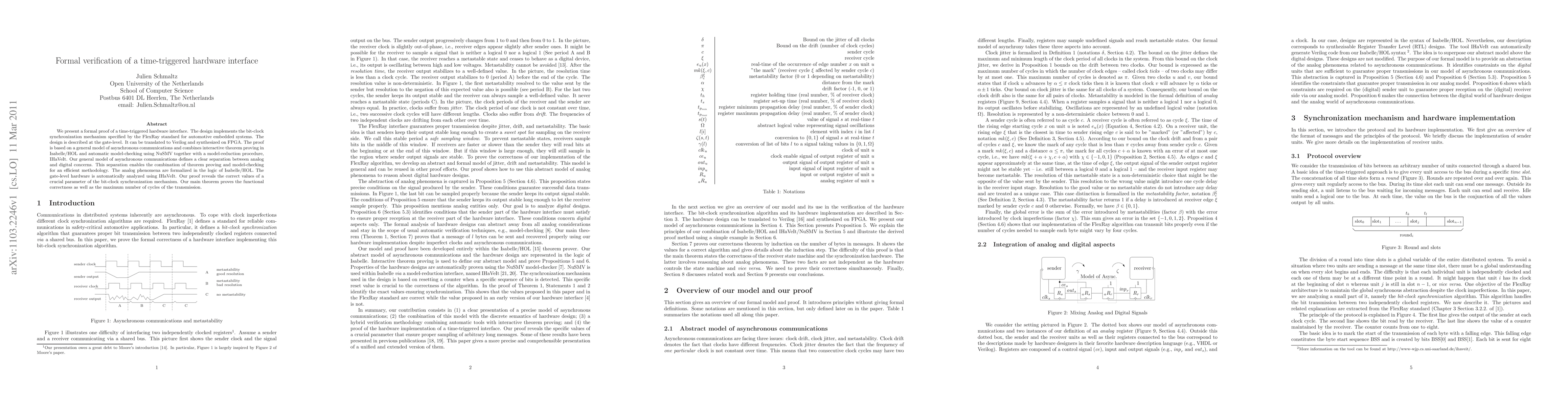 We present a formal proof of a time-triggered hardware interface. The design implements the bit-clock synchronization mechanism specified by the FlexRay standard for automotive embedded systems. The design is described at the gate-level. It can be translated to Verilog and synthesized on FPGA. The proof is based on a general model of asynchronous communications and combines interactive theorem proving in Isabelle/HOL and automatic model-checking using NuSMV together with a model-reduction procedure, IHaVeIt. Our general model of asynchronous communications defines a clear separation between analog and digital concerns. This separation enables the combination of theorem proving and model-checking for an efficient methodology. The analog phenomena are formalized in the logic of Isabelle/HOL. The gate-level hardware is automatically analyzed using IHaVeIt. Our proof reveals the correct values of a crucial parameter of the bit-clock synchronization mechanism. Our main theorem proves the functional correctness as well as the maximum number of cycles of the transmission.
