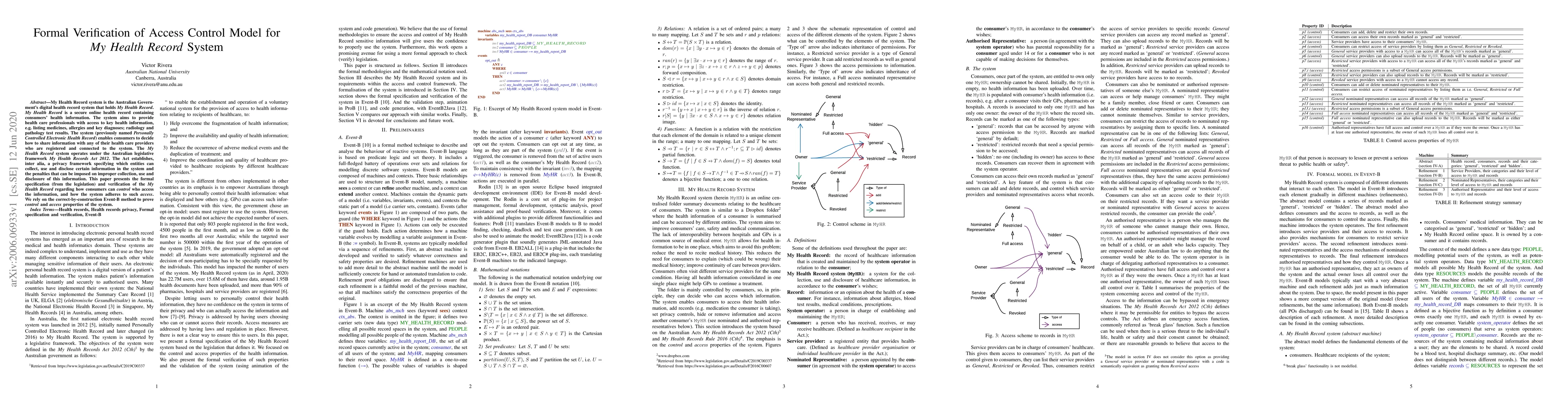 My Health Record system is the Australian Government's digital health record system that holds My Health Record. My Health Record is a secure online health record containing consumers' health information. The system aims to provide health care professionals with access to key health information, e.g. listing medicines, allergies and key diagnoses; radiology and pathology test results. The system (previously named Personally Controlled Electronic Health Record) enables consumers to decide how to share information with any of their health care providers who are registered and connected to the system. The My Health Record system operates under the Australian legislative framework My Health Records Act 2012. The Act establishes, inter alia, a privacy framework specifying which entities can collect, use and disclose certain information in the system and the penalties that can be imposed on improper collection, use and disclosure of this information. This paper presents the formal specification (from the legislation) and verification of the My Health Record regarding how consumers can control who access the information, and how the system adheres to such access. We rely on the correct-by-construction Event-B method to prove control and access properties of the system.