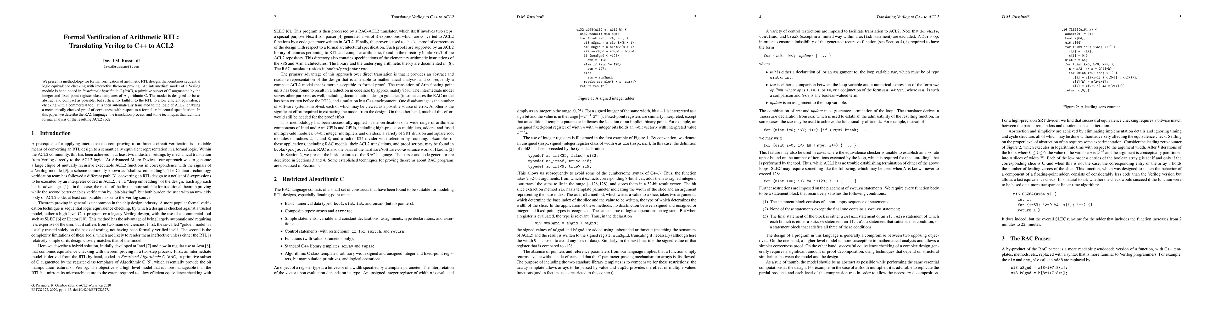 This research presents a methodology for formally verifying arithmetic RTL designs by combining logic equivalence checking and interactive theorem proving. It involves translating a hand-coded Verilog model, expressed in RAC, to ACL2 for mechanically checked correctness proofs against formal specifications.