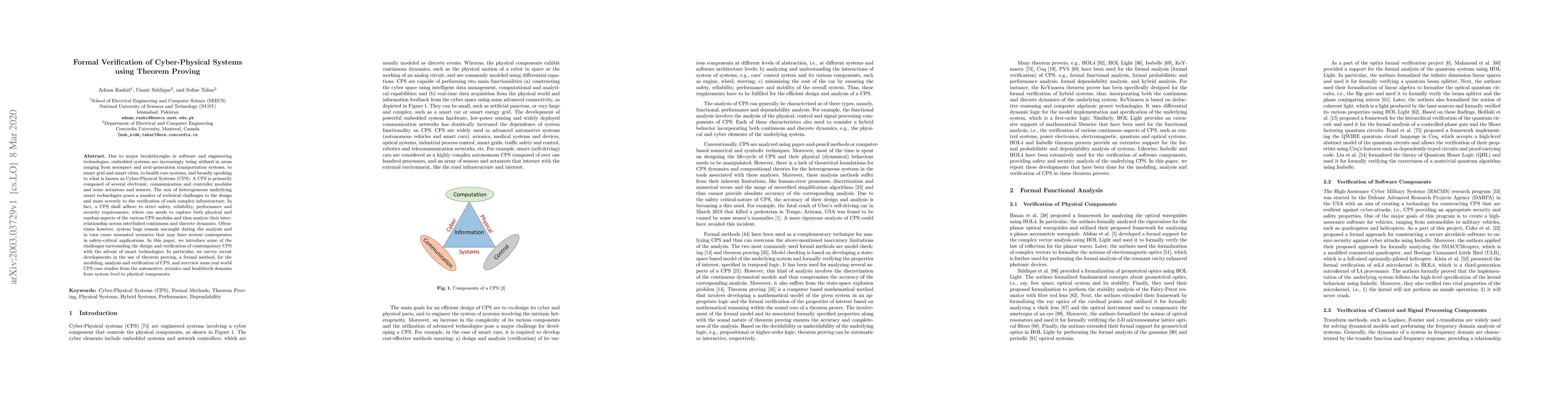 The paper surveys recent developments in using theorem proving for modeling, analysis, and verification of Cyber-Physical Systems (CPS), covering case studies from automotive, avionics, and healthtech domains.