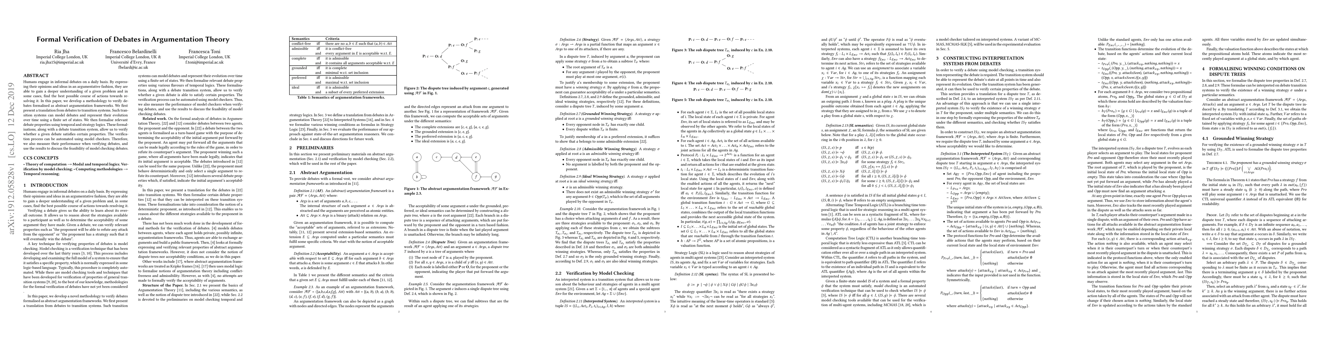 Humans engage in informal debates on a daily basis. By expressing their opinions and ideas in an argumentative fashion, they are able to gain a deeper understanding of a given problem and in some cases, find the best possible course of actions towards resolving it. In this paper, we develop a methodology to verify debates formalised as abstract argumentation frameworks. We first present a translation from debates to transition systems. Such transition systems can model debates and represent their evolution over time using a finite set of states. We then formalise relevant debate properties using temporal and strategy logics. These formalisations, along with a debate transition system, allow us to verify whether a given debate satisfies certain properties. The verification process can be automated using model checkers. Therefore, we also measure their performance when verifying debates, and use the results to discuss the feasibility of model checking debates.