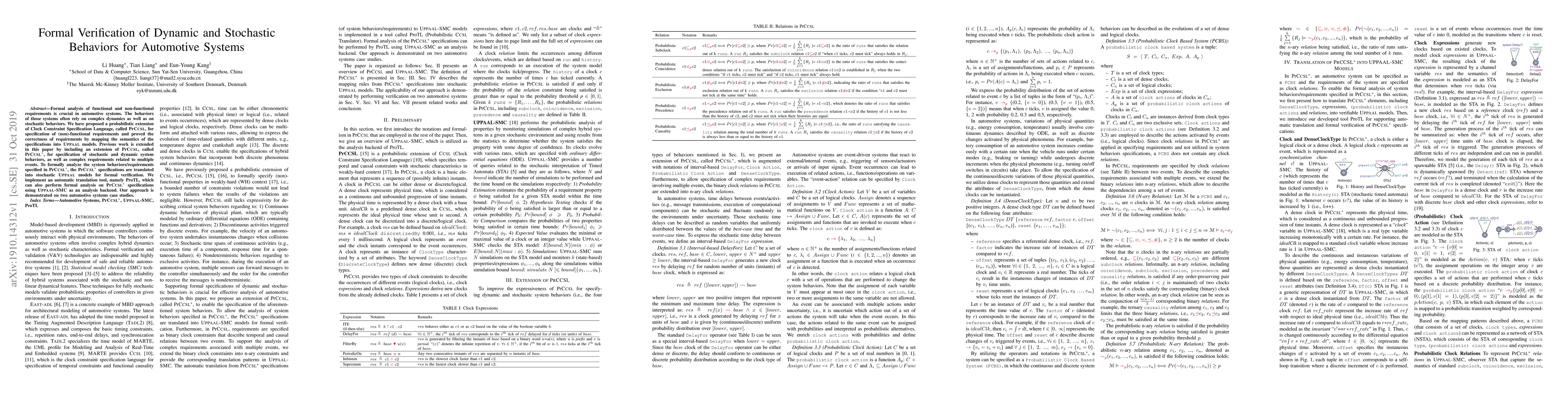 Formal analysis of functional and non-functional requirements is crucial in automotive systems. The behaviors of those systems often rely on complex dynamics as well as on stochastic behaviors. We have proposed a probabilistic extension of Clock Constraint Specification Language, called PrCCSL,for specification of (non)-functional requirements and proved the correctness of requirements by mapping the semantics of the specifications into UPPAAL models. Previous work is extended in this paper by including an extension of PrCCSL, called PrCCSL*, for specification of stochastic and dynamic system behaviors, as well as complex requirements related to multiple events. To formally analyze the system behaviors/requirements specified in PrCCSL*, the PrCCSL* specifications are translated into stochastic UPPAAL models for formal verification. We implement an automatic translation tool, namely ProTL, which can also perform formal analysis on PrCCSL* specifications using UPPAAL-SMC as an analysis backend. Our approach is demonstrated on two automotive systems case studies.