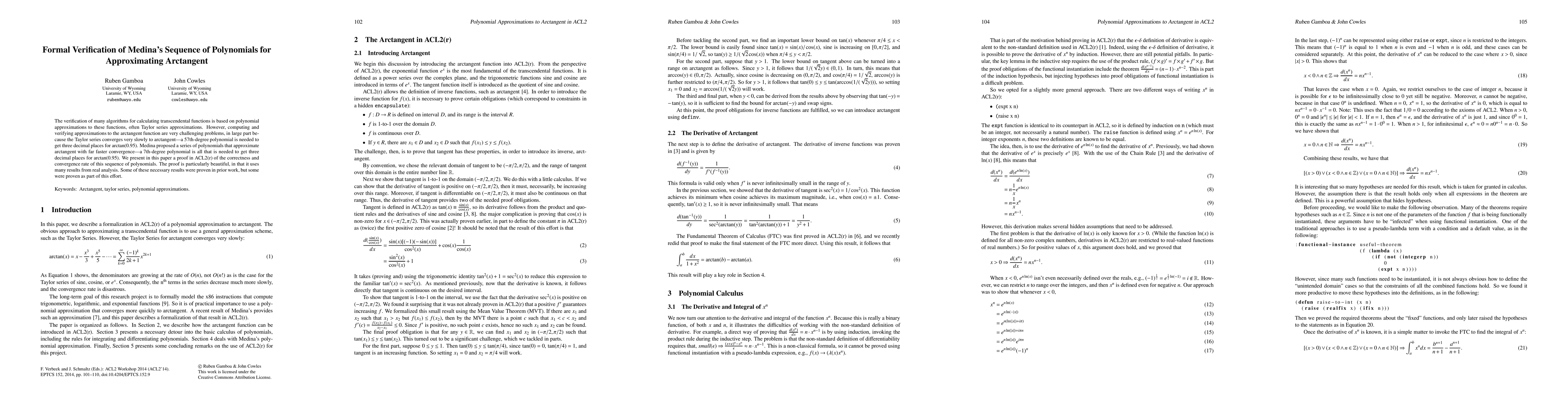 This paper presents a formal verification in ACL2(r) of Medina's sequence of polynomials for approximating arctangent, demonstrating faster convergence compared to Taylor series. The proof leverages real analysis results, some newly proven, to establish correctness and convergence rate.