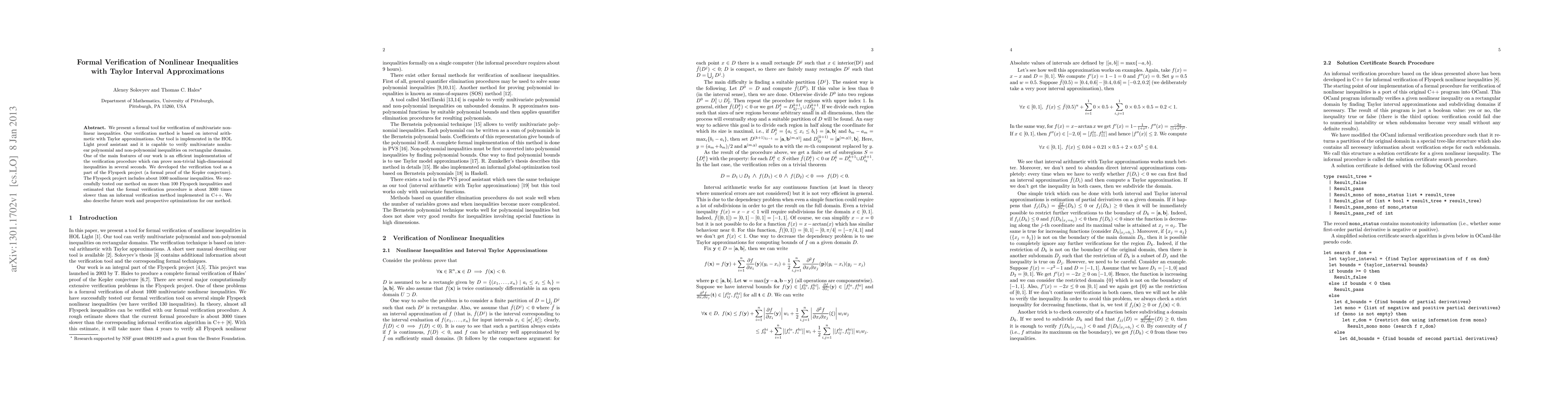 This paper introduces a formal verification tool for multivariate nonlinear inequalities based on Taylor interval approximations, implemented in HOL Light. It successfully verifies high-dimensional inequalities, playing a role in the Flyspeck project for the Kepler conjecture, though it is significantly slower than informal C++ methods.