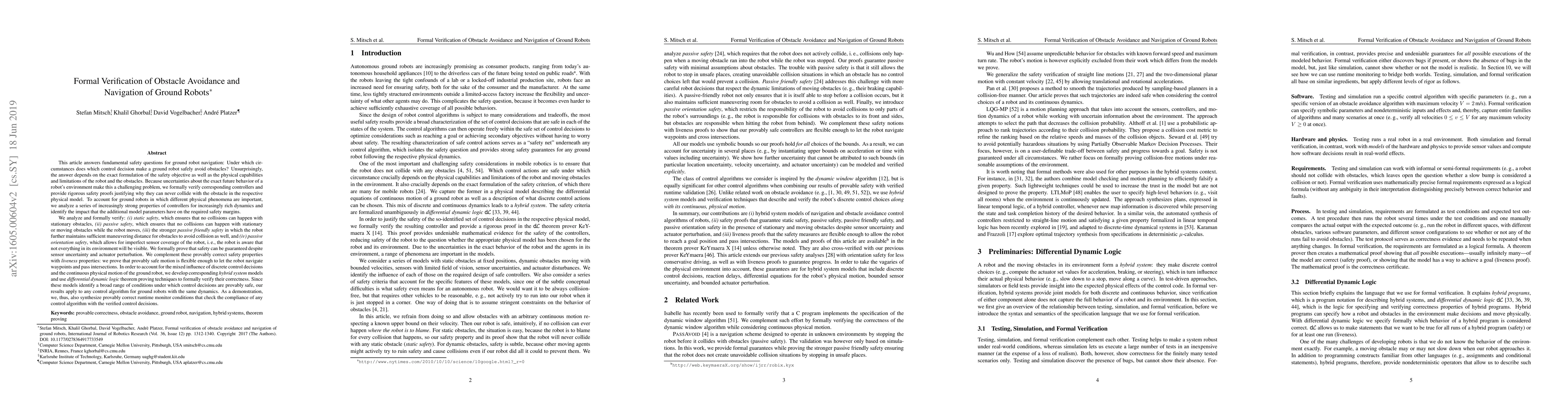 This research paper formally verifies safety properties for obstacle-avoiding robots, ensuring they can navigate dynamic environments without collisions, while also addressing limitations due to sensor uncertainty and actuator perturbations.