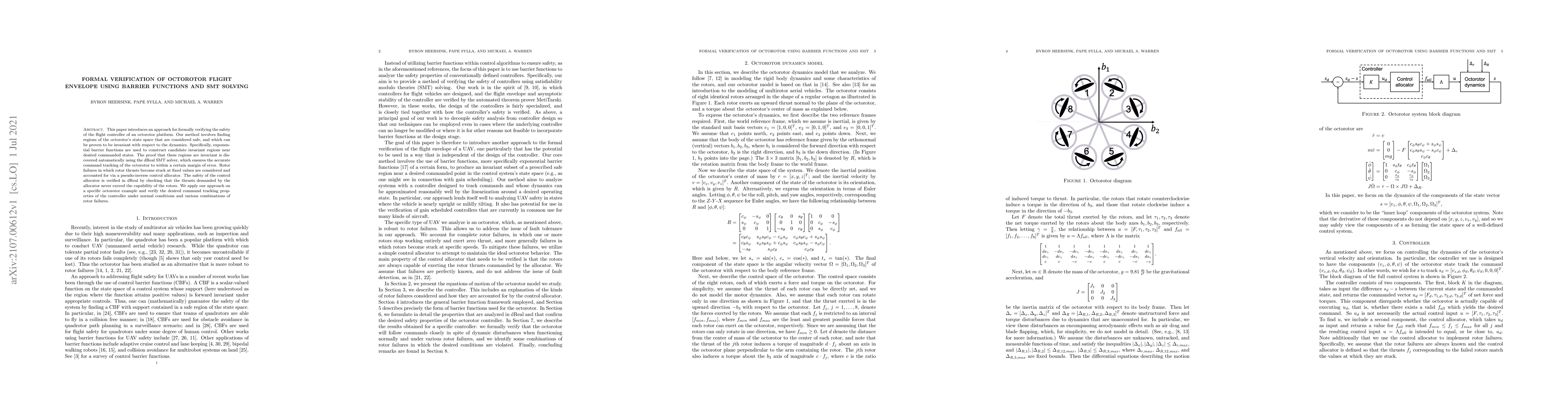 This paper introduces an approach for formally verifying the safety of the flight controller of an octorotor platform. Our method involves finding regions of the octorotor's state space that are considered safe, and which can be proven to be invariant with respect to the dynamics. Specifically, exponential barrier functions are used to construct candidate invariant regions near desired commanded states. The proof that these regions are invariant is discovered automatically using the dReal SMT solver, which ensures the accurate command tracking of the octorotor to within a certain margin of error. Rotor failures in which rotor thrusts become stuck at fixed values are considered and accounted for via a pseudo-inverse control allocator. The safety of the control allocator is verified in dReal by checking that the thrusts demanded by the allocator never exceed the capability of the rotors. We apply our approach on a specific octorotor example and verify the desired command tracking properties of the controller under normal conditions and various combinations of rotor failures.