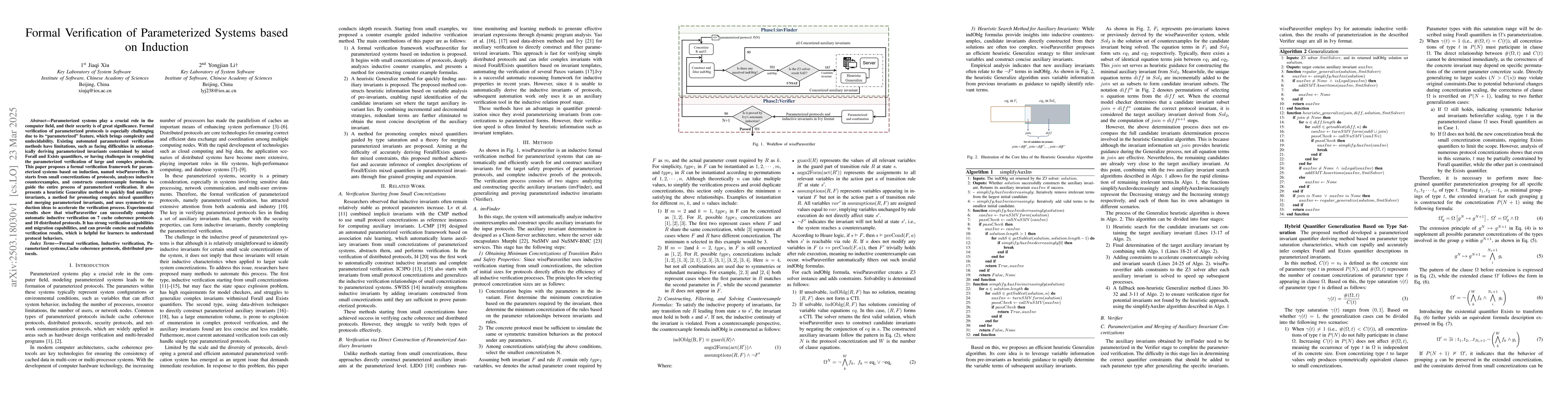 This paper proposes wiseParaverifier, a formal verification framework for parameterized systems based on induction. It uses a workflow involving small protocol concretizations, inductive counterexample analysis, and construction of counterexample formulas to guide verification. It also introduces a heuristic Generalize method for quick auxiliary invariant discovery, techniques for handling complex mixed quantifiers, and symmetric reduction ideas for verification acceleration.