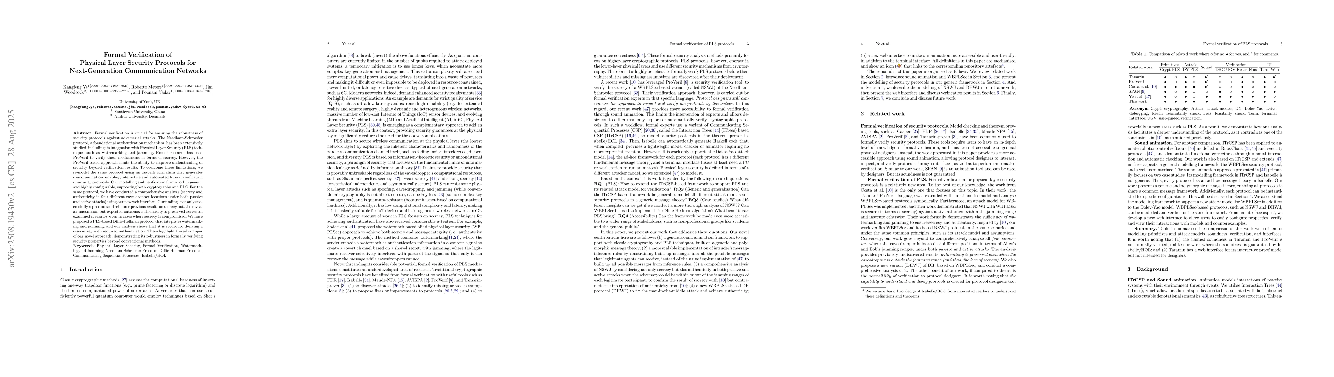 Formal verification is crucial for ensuring the robustness of security protocols against adversarial attacks. The Needham-Schroeder protocol, a foundational authentication mechanism, has been extensively studied, including its integration with Physical Layer Security (PLS) techniques such as watermarking and jamming. Recent research has used ProVerif to verify these mechanisms in terms of secrecy. However, the ProVerif-based approach limits the ability to improve understanding of security beyond verification results. To overcome these limitations, we re-model the same protocol using an Isabelle formalism that generates sound animation, enabling interactive and automated formal verification of security protocols. Our modelling and verification framework is generic and highly configurable, supporting both cryptography and PLS. For the same protocol, we have conducted a comprehensive analysis (secrecy and authenticity in four different eavesdropper locations under both passive and active attacks) using our new web interface. Our findings not only successfully reproduce and reinforce previous results on secrecy but also reveal an uncommon but expected outcome: authenticity is preserved across all examined scenarios, even in cases where secrecy is compromised. We have proposed a PLS-based Diffie-Hellman protocol that integrates watermarking and jamming, and our analysis shows that it is secure for deriving a session key with required authentication. These highlight the advantages of our novel approach, demonstrating its robustness in formally verifying security properties beyond conventional methods.