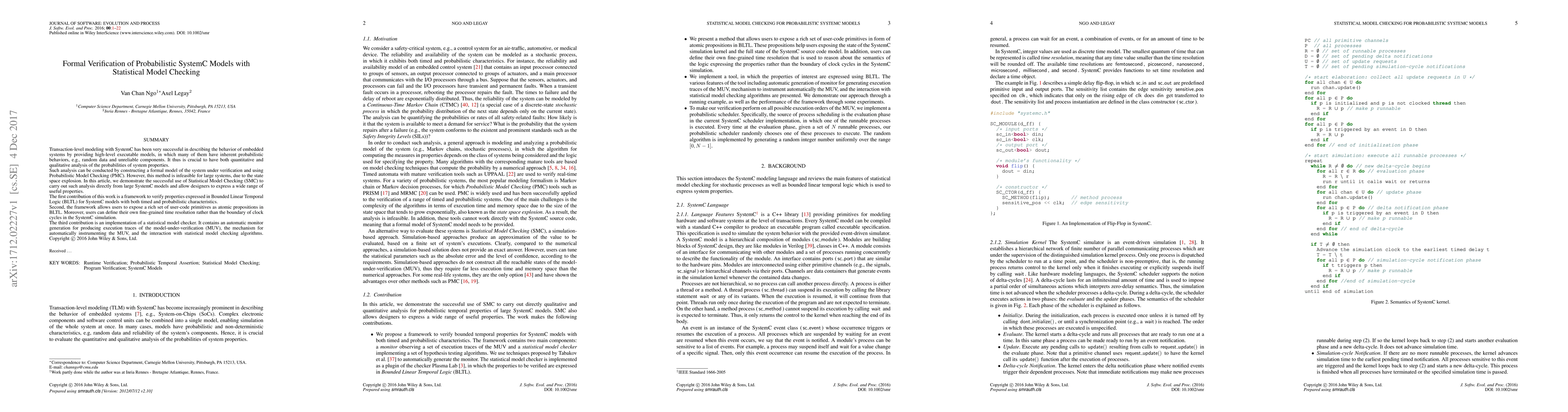 This paper presents a framework for verifying probabilistic SystemC models using Statistical Model Checking (SMC) to address state space explosion issues. It introduces a method for verifying properties in Bounded Linear Temporal Logic (BLTL) and implements a statistical model checker with automatic trace generation and instrumentation.