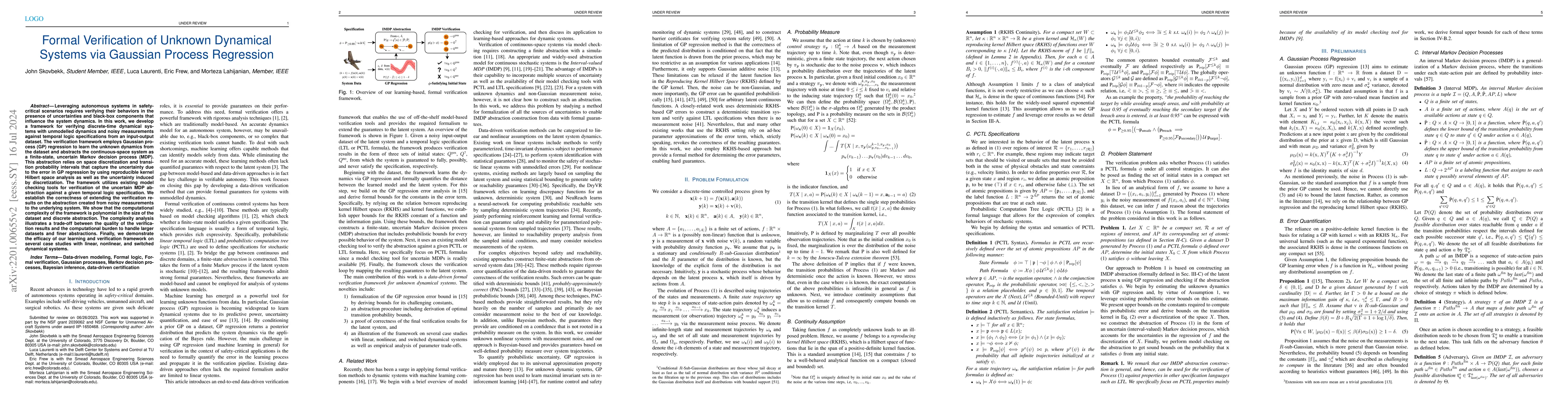 This paper presents a framework for verifying unknown dynamical systems using Gaussian process regression to model uncertain dynamics, abstracting them as uncertain Markov decision processes, and employing model checking for temporal logic specifications. The framework's computational complexity is polynomial, balancing verification accuracy with dataset size and abstraction granularity.