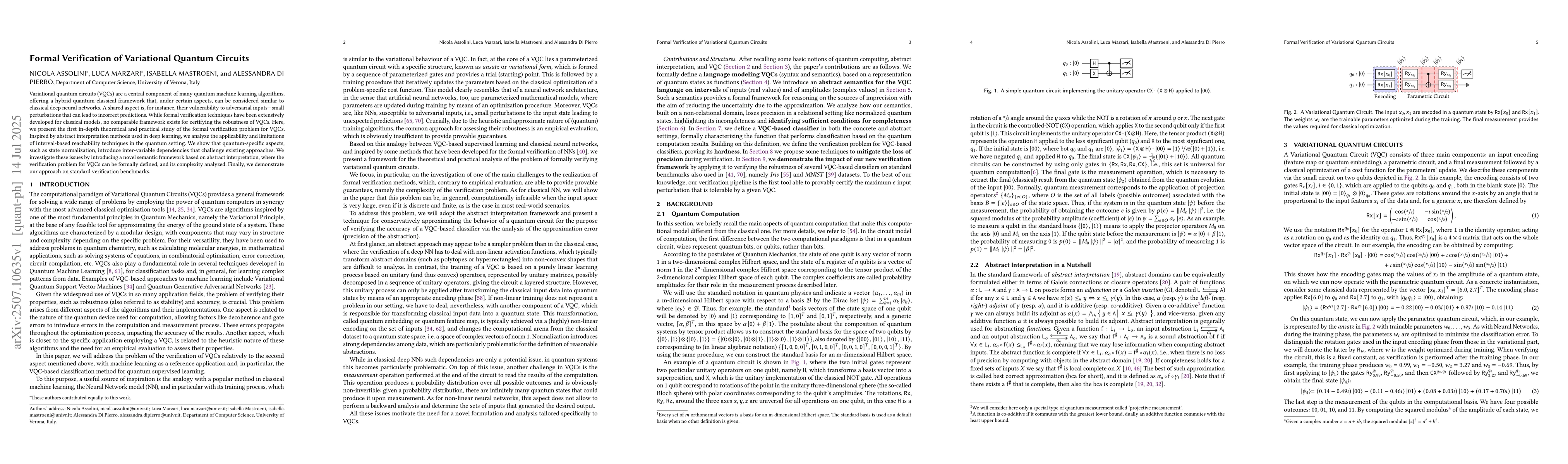 Variational quantum circuits (VQCs) are a central component of many quantum machine learning algorithms, offering a hybrid quantum-classical framework that, under certain aspects, can be considered similar to classical deep neural networks. A shared aspect is, for instance, their vulnerability to adversarial inputs, small perturbations that can lead to incorrect predictions. While formal verification techniques have been extensively developed for classical models, no comparable framework exists for certifying the robustness of VQCs. Here, we present the first in-depth theoretical and practical study of the formal verification problem for VQCs. Inspired by abstract interpretation methods used in deep learning, we analyze the applicability and limitations of interval-based reachability techniques in the quantum setting. We show that quantum-specific aspects, such as state normalization, introduce inter-variable dependencies that challenge existing approaches. We investigate these issues by introducing a novel semantic framework based on abstract interpretation, where the verification problem for VQCs can be formally defined, and its complexity analyzed. Finally, we demonstrate our approach on standard verification benchmarks.