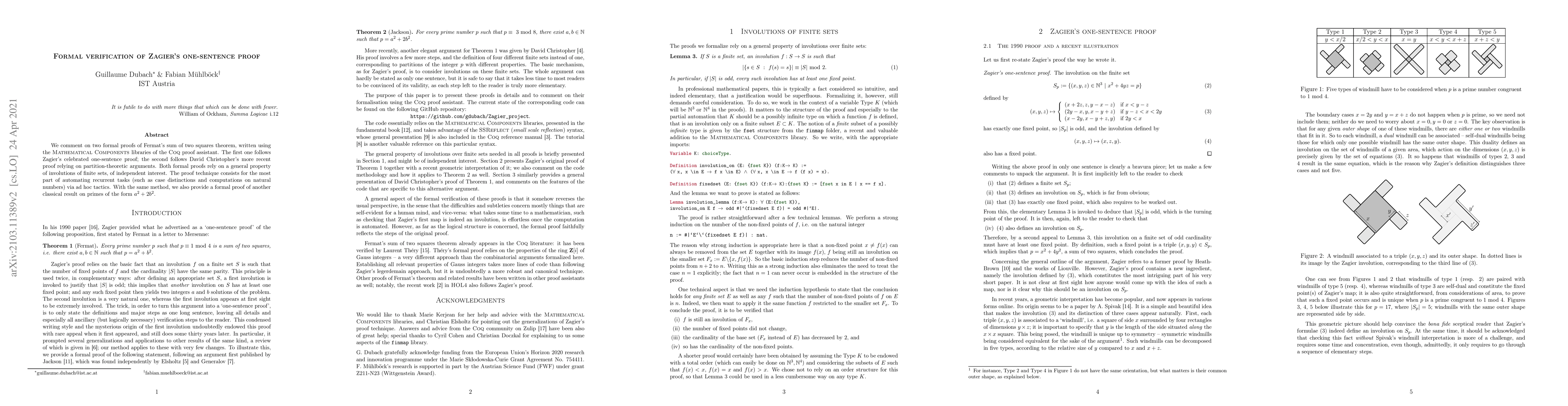 This paper presents formal proofs of Fermat's sum of two squares theorem using Coq, with one proof following Zagier's concise one-sentence proof and the other David Christopher's partition-theoretic proof. Both proofs leverage the same property of involutions of finite sets.