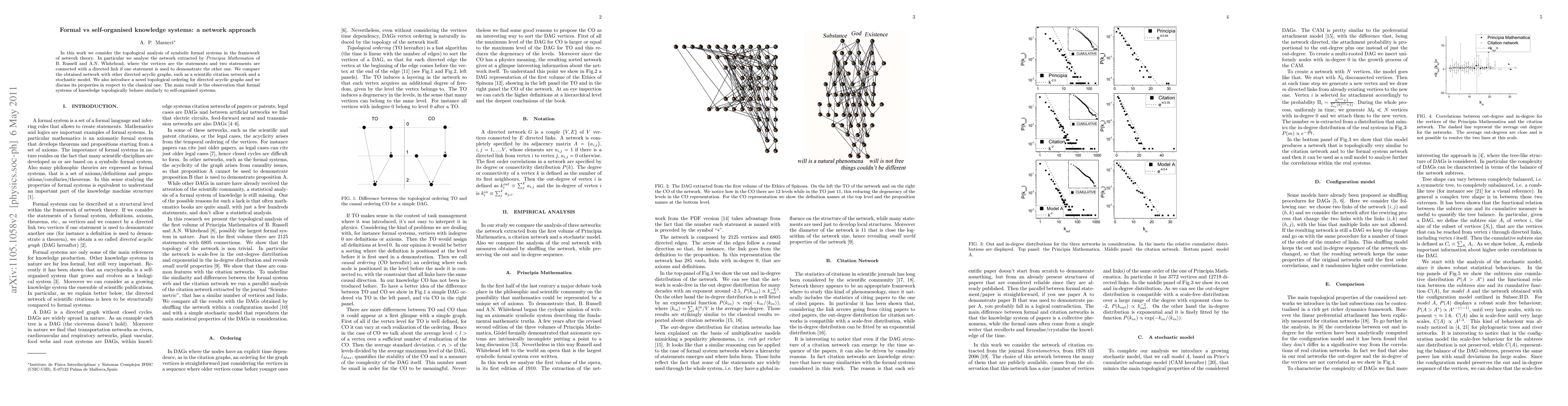 This paper uses network theory to analyze the structure of formal knowledge systems, exemplified by Principia Mathematica, and compares it to self-organized systems. It introduces a novel topological ordering for directed acyclic graphs and finds that formal systems exhibit topological similarities to self-organized systems.