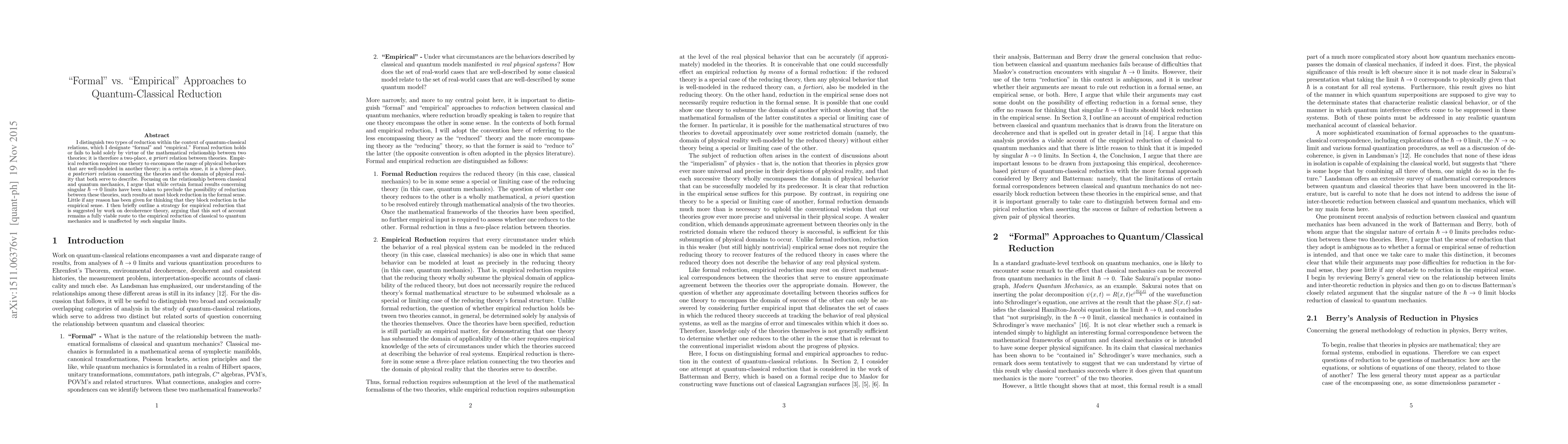 I distinguish two types of reduction within the context of quantum-classical relations, which I designate "formal" and "empirical". Formal reduction holds or fails to hold solely by virtue of the mathematical relationship between two theories; it is therefore a two-place, a priori relation between theories. Empirical reduction requires one theory to encompass the range of physical behaviors that are well-modeled in another theory; in a certain sense, it is a three-place, a posteriori relation connecting the theories and the domain of physical reality that both serve to describe. Focusing on the relationship between classical and quantum mechanics, I argue that while certain formal results concerning singular limits as Planck's constant goes to zero have been taken to preclude the possibility of reduction between these theories, such results at most block reduction in the formal sense; little if any reason has been given for thinking that they block reduction in the empirical sense. I then briefly outline a strategy for empirical reduction that is suggested by work on decoherence theory, arguing that this sort of account remains a fully viable route to the empirical reduction of classical to quantum mechanics and is unaffected by such singular limits.