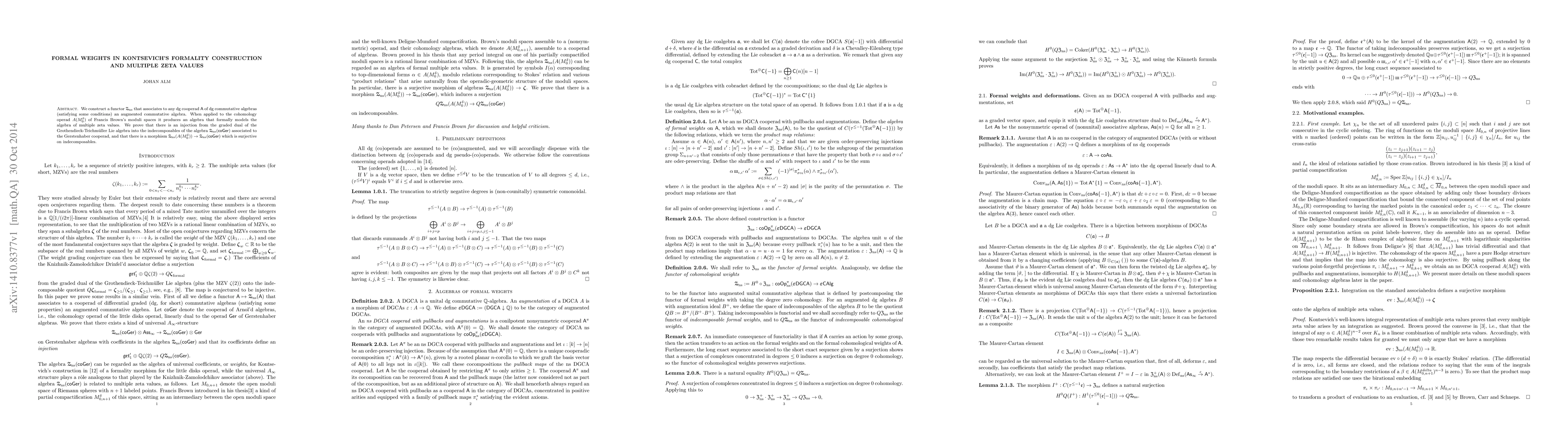 This paper constructs a functor linking dg cooperads of dg commutative algebras to augmented commutative algebras, showing it models the algebra of multiple zeta values when applied to Brown's moduli spaces. It also establishes an injection from the dual of the Grothendieck-Teichmueller Lie algebra into the indecomposables of the Gerstenhaber cooperad and a surjective morphism from Brown's algebra to the Gerstenhaber cooperad algebra on indecomposables.