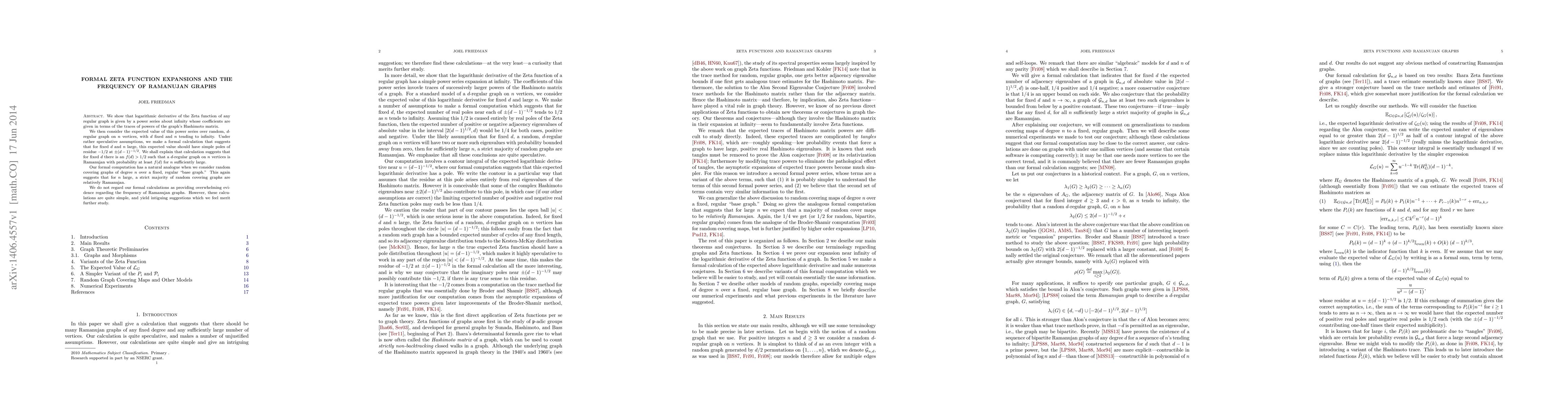 This paper explores the connection between graph theory and zeta function expansions, proposing that regular graphs' logarithmic derivatives of zeta functions' coefficients relate to Hashimoto matrices. Formal calculations under speculative assumptions suggest that for large $n$, a majority of random $d$-regular and covering graphs are relatively Ramanujan, indicating a higher probability of these graphs having desirable spectral properties. The authors acknowledge the need for further investigation due to the simplicity and intrigue of their findings.