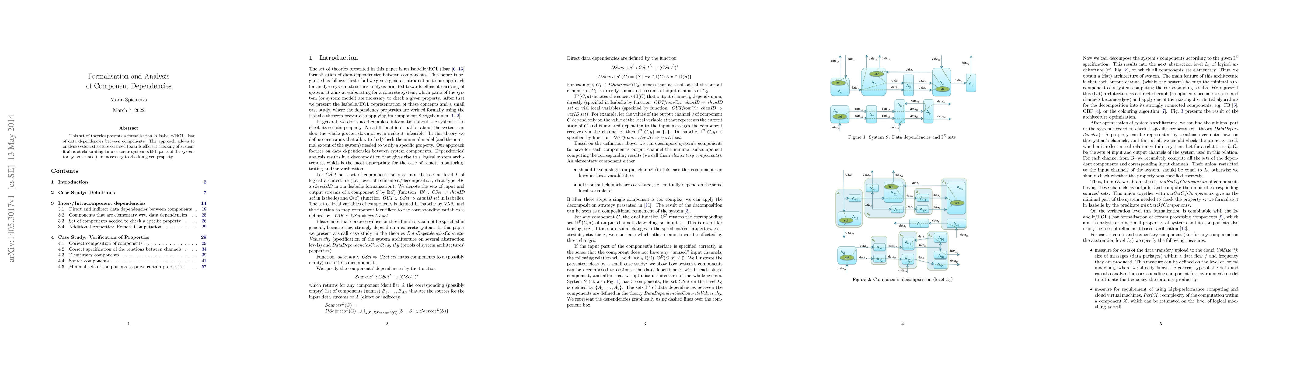 This set of theories presents a formalisation in Isabelle/HOL+Isar of data dependencies between components. The approach allows to analyse system structure oriented towards efficient checking of system: it aims at elaborating for a concrete system, which parts of the system (or system model) are necessary to check a given property.