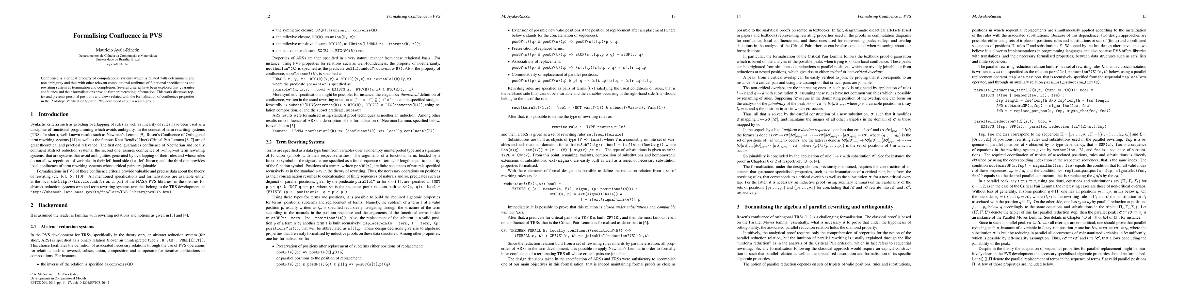 This paper explores the formalisation of confluence properties in computational systems using the Prototype Verification System (PVS), focusing on how confluence relates to determinism, termination, and completion. The authors present their research group's perspectives on criteria that guarantee confluence.