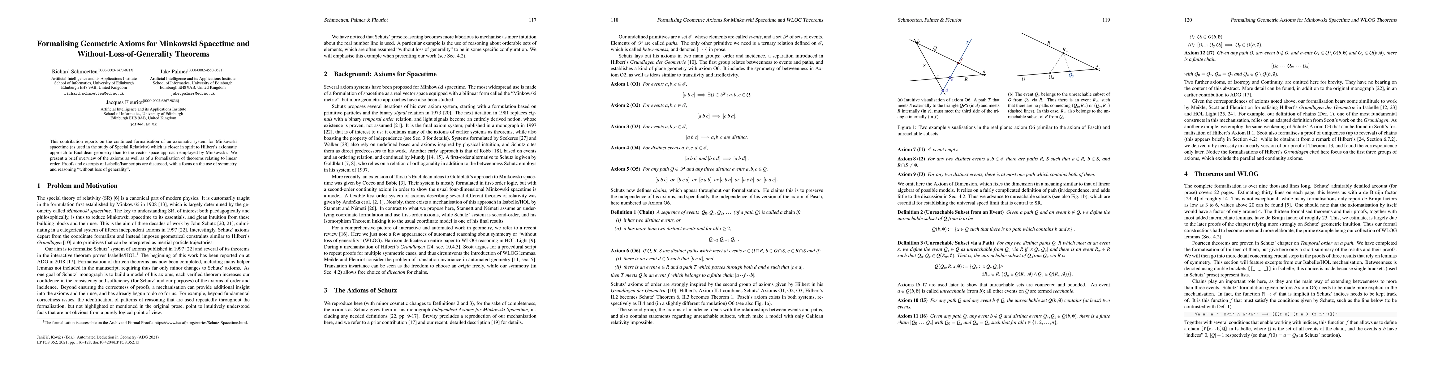 This paper formalises axioms for Minkowski spacetime using a Hilbert-like approach, with a focus on linear order theorems and 'without loss of generality' reasoning.
