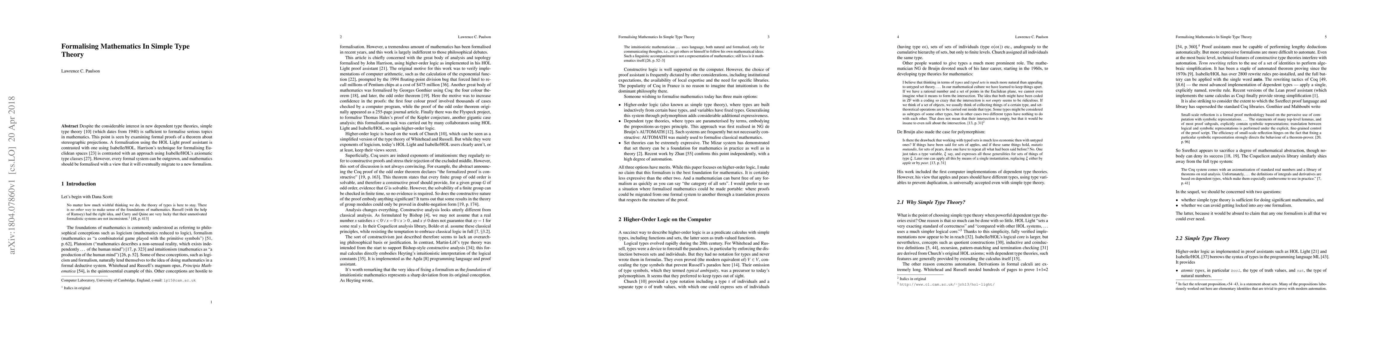 Despite the considerable interest in new dependent type theories, simple type theory (which dates from 1940) is sufficient to formalise serious topics in mathematics. This point is seen by examining formal proofs of a theorem about stereographic projections. A formalisation using the HOL Light proof assistant is contrasted with one using Isabelle/HOL. Harrison's technique for formalising Euclidean spaces is contrasted with an approach using Isabelle/HOL's axiomatic type classes. However, every formal system can be outgrown, and mathematics should be formalised with a view that it will eventually migrate to a new formalism.