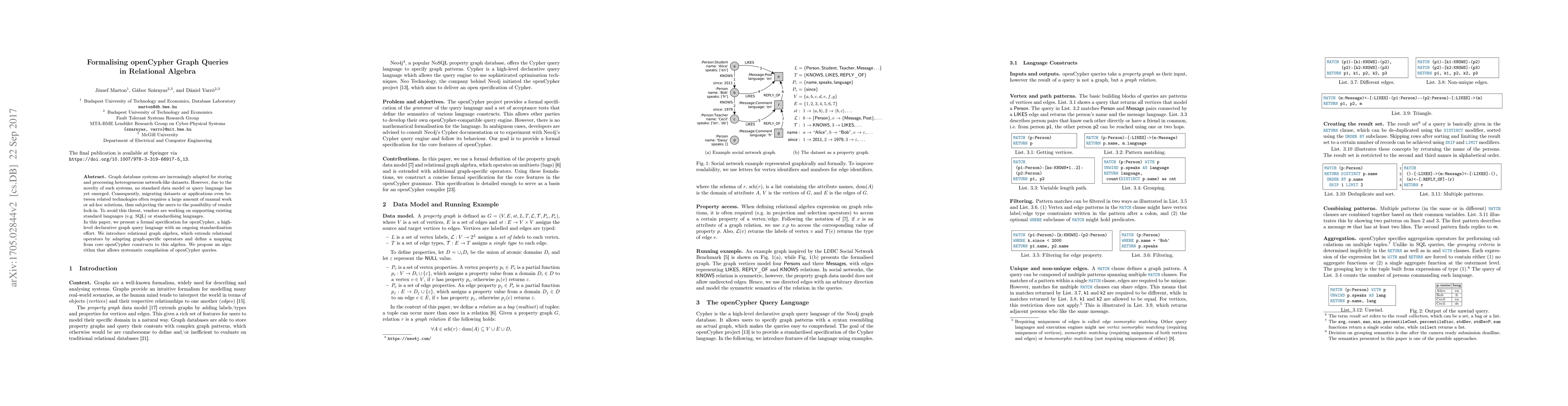 This paper formalizes openCypher, a high-level graph query language, by introducing relational graph algebra and mapping openCypher constructs to it. The authors propose an algorithm for systematically compiling openCypher queries, aiming to standardize graph querying and reduce vendor lock-in.