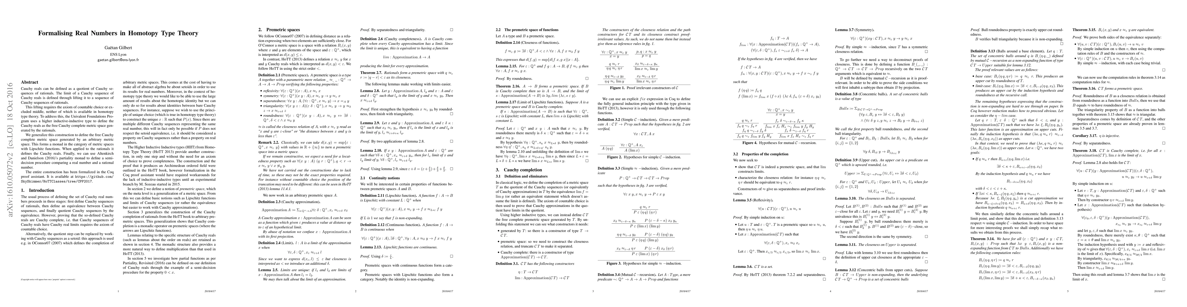 Cauchy reals can be defined as a quotient of Cauchy sequences of rationals. The limit of a Cauchy sequence of Cauchy reals is defined through lifting it to a sequence of Cauchy sequences of rationals. This lifting requires the axiom of countable choice or excluded middle, neither of which is available in homotopy type theory. To address this, the Univalent Foundations Program uses a higher inductive-inductive type to define the Cauchy reals as the free Cauchy complete metric space generated by the rationals. We generalize this construction to define the free Cauchy complete metric space generated by an arbitrary metric space. This forms a monad in the category of metric spaces with Lipschitz functions. When applied to the rationals it defines the Cauchy reals. Finally, we can use Altenkirch and Danielson (2016)'s partiality monad to define a semi-decision procedure comparing a real number and a rational number. The entire construction has been formalized in the Coq proof assistant. It is available at https://github.com/SkySkimmer/HoTTClasses/tree/CPP2017 .