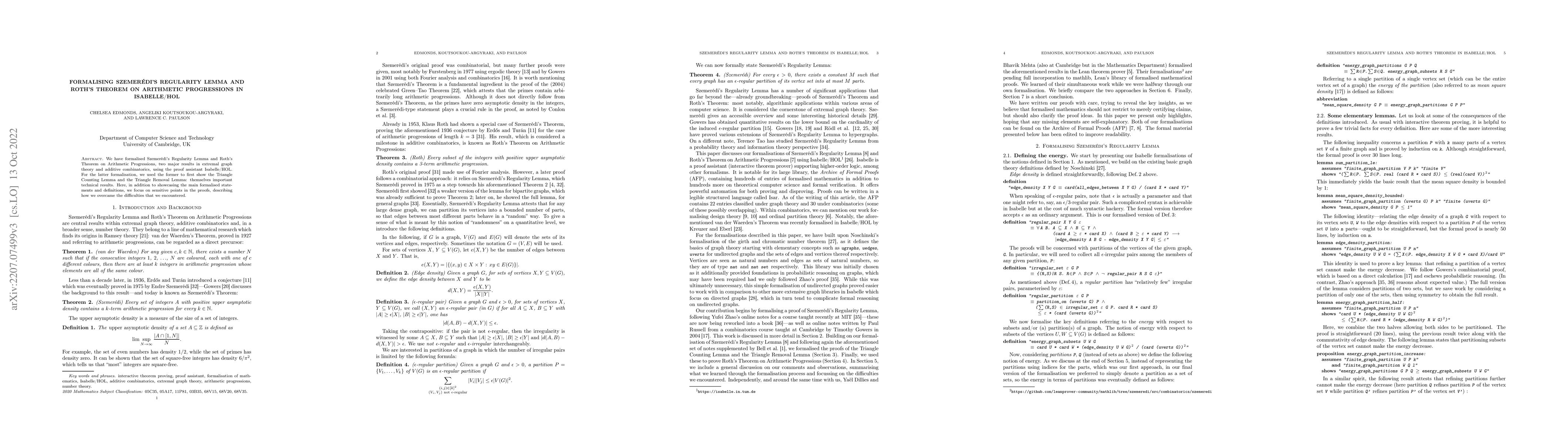 This work distinguishes itself by providing the first formalization of these theorems in Isabelle/HOL, addressing challenges such as disjointness constraints in edge density definitions and offering insights into the nuances of regular pair definitions.