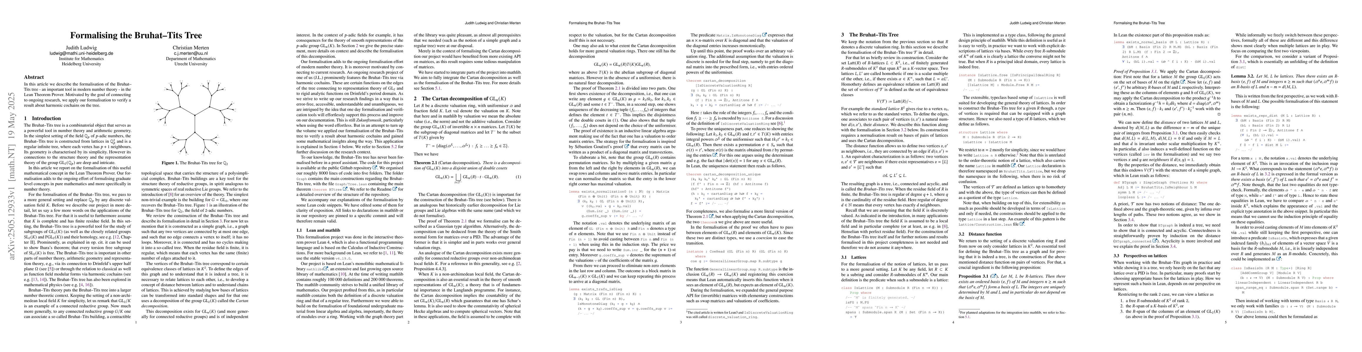 This paper formalizes the Bruhat-Tits tree in Lean Theorem Prover to connect with ongoing research, enabling verification of a harmonic cochain result. It provides an important tool for modern number theory.