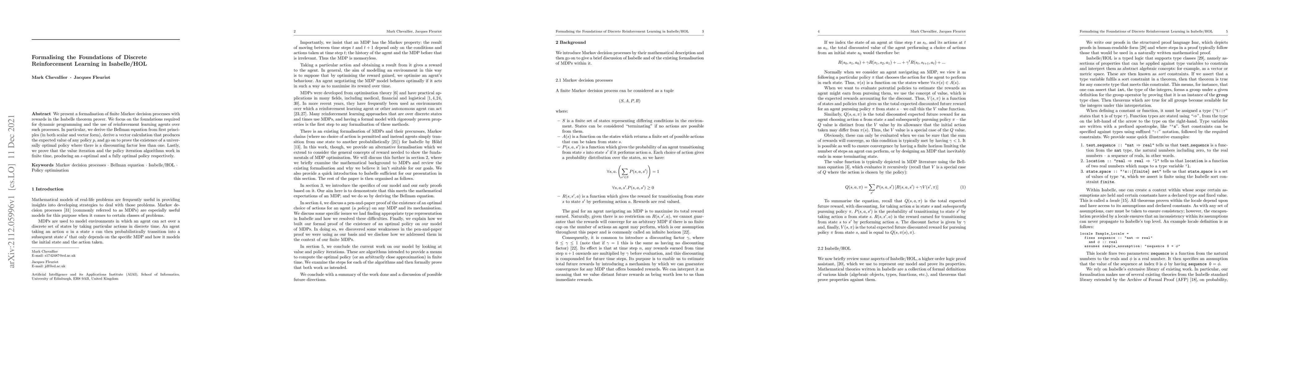 This paper formally verifies discrete reinforcement learning concepts in Isabelle/HOL, deriving the Bellman equation and proving the existence of optimal policies with discounting factors under one. It also validates finite-time convergence of value and policy iteration algorithms.