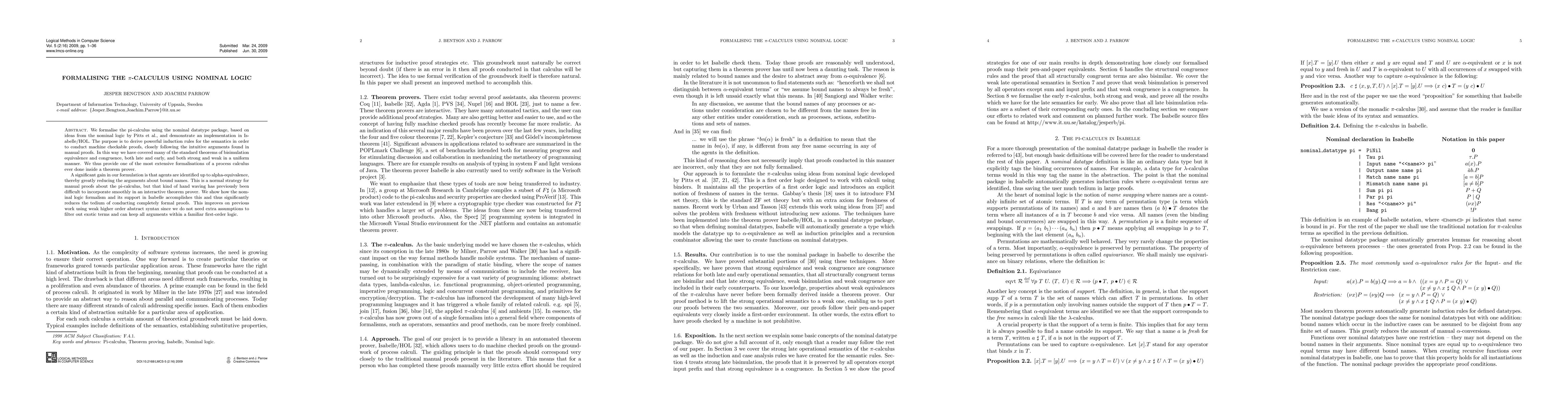 This paper formalizes the pi-calculus using nominal logic in Isabelle/HOL, deriving induction rules for machine-checkable proofs and covering bisimulation equivalence theorems. The nominal logic approach identifies agents up to alpha-equivalence, simplifying formal proofs and reducing the need for extra assumptions.