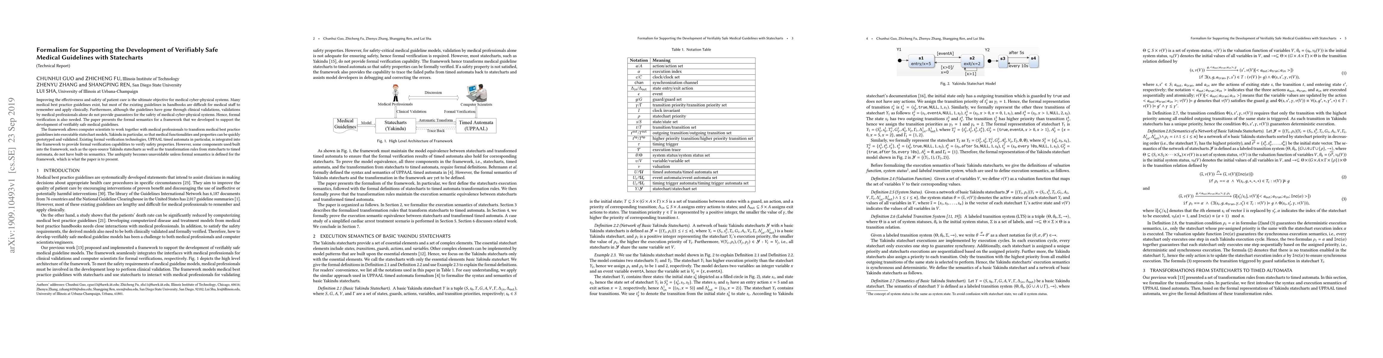 Improving the effectiveness and safety of patient care is the ultimate objective for medical cyber-physical systems. Many medical best practice guidelines exist, but most of the existing guidelines in handbooks are difficult for medical staff to remember and apply clinically. Furthermore, although the guidelines have gone through clinical validations, validations by medical professionals alone do not provide guarantees for the safety of medical cyber-physical systems. Hence, formal verification is also needed. The paper presents the formal semantics for a framework that we developed to support the development of verifiably safe medical guidelines. The framework allows computer scientists to work together with medical professionals to transform medical best practice guidelines into executable statechart models, Yakindu in particular, so that medical functionalities and properties can be quickly prototyped and validated. Existing formal verification technologies, UPPAAL timed automata in particular, is integrated into the framework to provide formal verification capabilities to verify safety properties. However, some components used/built into the framework, such as the open-source Yakindu statecharts as well as the transformation rules from statecharts to timed automata, do not have built-in semantics. The ambiguity becomes unavoidable unless formal semantics is defined for the framework, which is what the paper is to present.