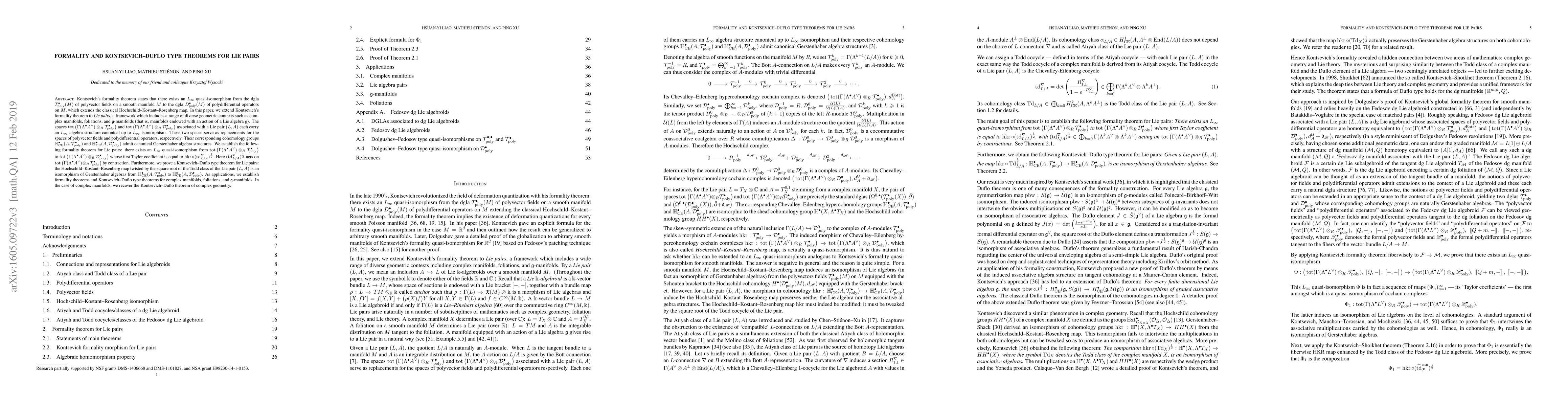 $\newcommand{\poly}{_{\operatorname{poly}}^{\bullet}}\newcommand{\td}{(\operatorname{td}_{L/A}^{\nabla})^{\frac{1}{2}}}\newcommand{\cx}[1]{\operatorname{tot}\big(\Gamma(\Lambda^\bullet A^\vee)\otimes_R\mathcal{#1}\poly\big)}\newcommand{\cy}[1]{\mathbb{H}^\bullet_{\operatorname{CE}}(A,\mathcal{#1}\poly)}$Kontsevich's formality theorem states that there exists an $L_\infty$ quasi-isomorphism from the dgla $T\poly(M)$ of polyvector fields on a smooth manifold $M$ to the dgla $D\poly(M)$ of polydifferential operators on $M$, which extends the classical Hochschild--Kostant--Rosenberg map. In this paper, we extend Kontsevich's formality theorem to Lie pairs, a framework which includes a range of diverse geometric contexts such as complex manifolds, foliations, and $\mathfrak{g}$-manifolds. The spaces $\cx{T}$ and $\cx{D}$ associated with a Lie pair $(L,A)$ each carry an $L_\infty$ algebra structure canonical up to $L_\infty$ isomorphism. These two spaces serve as replacements for the spaces of polyvector fields and polydifferential operators, respectively. Their corresponding cohomology groups $\cy{T}$ and $\cy{D}$ admit canonical Gerstenhaber algebra structures. We establish the following formality theorem for Lie pairs: there exists an $L_\infty$ quasi isomorphism from $\cx{T}$ to $\cx{D}$ whose first Taylor coefficient is equal to $\operatorname{hkr}\circ\td$. Here $\td$ acts on $\cx{T}$ by contraction. Furthermore, we prove a Kontsevich--Duflo type theorem for Lie pairs: the Hochschild--Kostant--Rosenberg map twisted by the square root of the Todd class of the Lie pair $(L,A)$ is an isomorphism of Gerstenhaber algebras from $\cy{T}$ to $\cy{D}$. As applications, we establish formality theorems and Kontsevich--Duflo type theorems for complex manifolds, foliations, and $\mathfrak{g}$-manifolds. In the case of complex manifolds, we recover the Kontsevich--Duflo theorem of complex geometry.