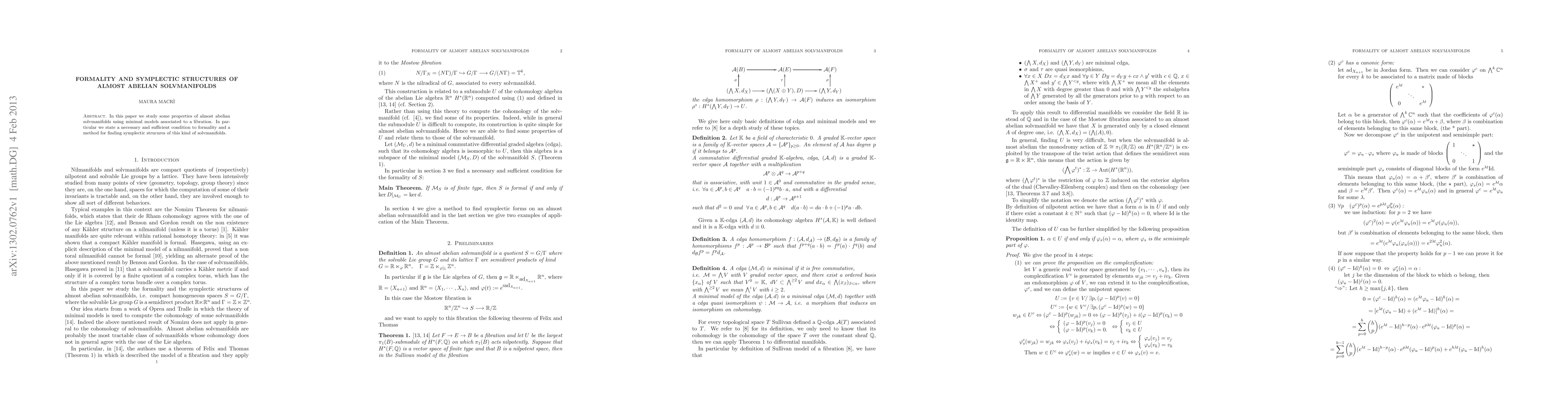 This paper investigates the formality and symplectic structures of almost abelian solvmanifolds through the use of minimal models linked to a fibration. It establishes a necessary and sufficient condition for formality and provides a method for identifying symplectic structures in these solvmanifolds.
