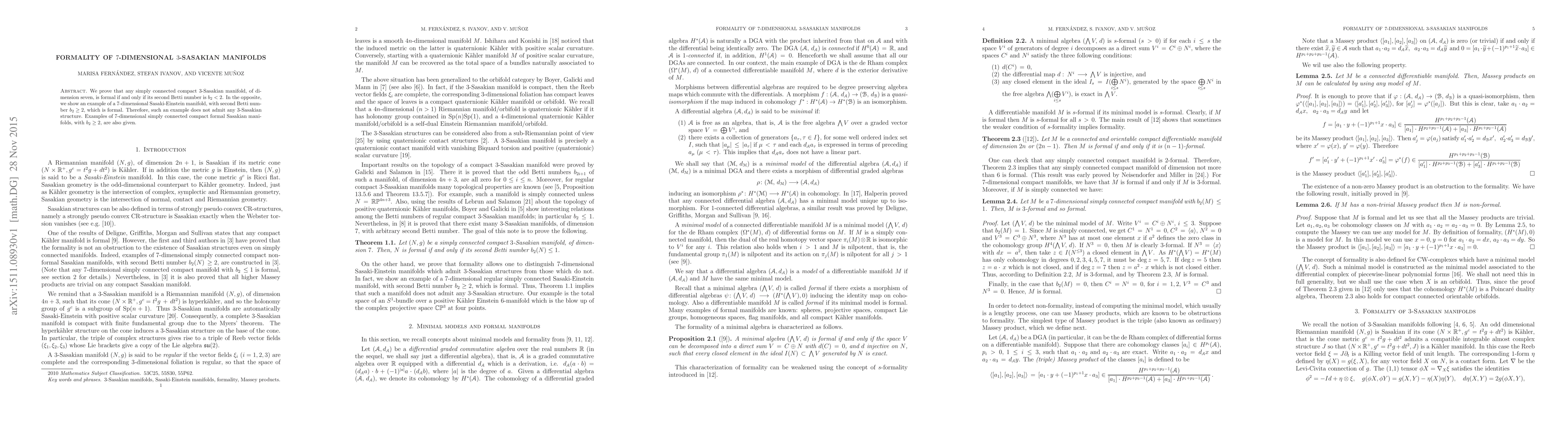 This paper proves that a simply connected compact 7-dimensional 3-Sasakian manifold is formal if its second Betti number is less than 2. It also presents a 7-dimensional Sasaki-Einstein manifold with $b_2 \geq 2$ that is formal, showing it cannot admit a 3-Sasakian structure.