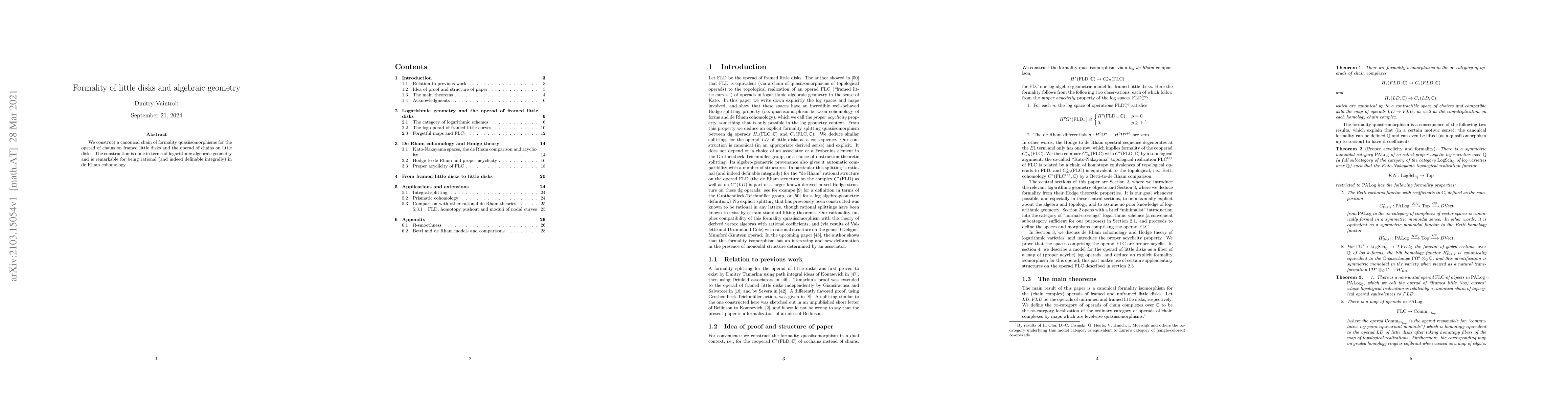 We construct a canonical chain of formality quasiisomorphisms for the operad of chains on framed little disks and the operad of chains on little disks. The construction is done in terms of logarithmic algebraic geometry and is remarkable for being rational (and indeed definable integrally) in de Rham cohomology.