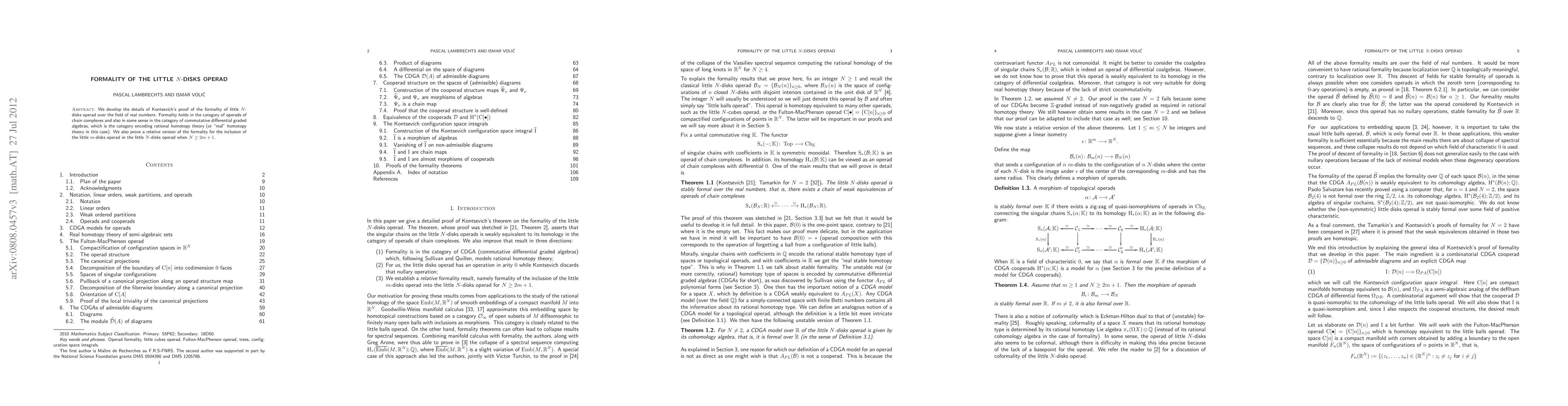 This paper presents Kontsevich's proof of the formality of little N-disks operad over the real numbers, establishing it in operads of chain complexes and commutative differential graded algebras. It also proves a relative formality for the inclusion of the little m-disks operad in the little N-disks operad when N ≥ 2m+1.
