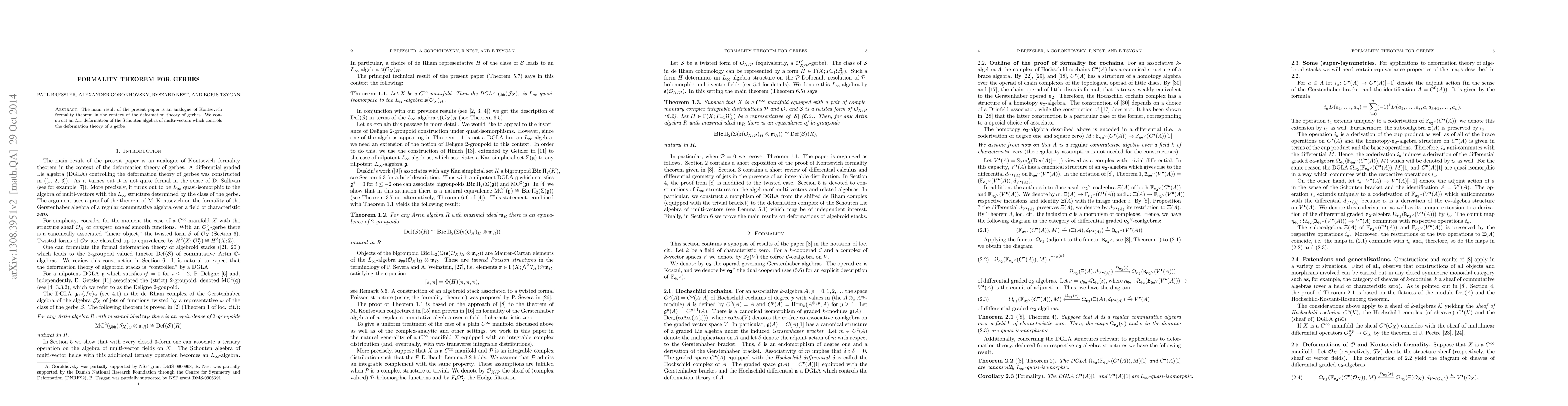 Summary: This paper extends Maxim Kontsevich's formality theorem to gerbes, demonstrating that gerbes on smooth and complex manifolds can be deformed to their formal counterparts. The result generalizes the original theorem to a broader category of geometric objects.