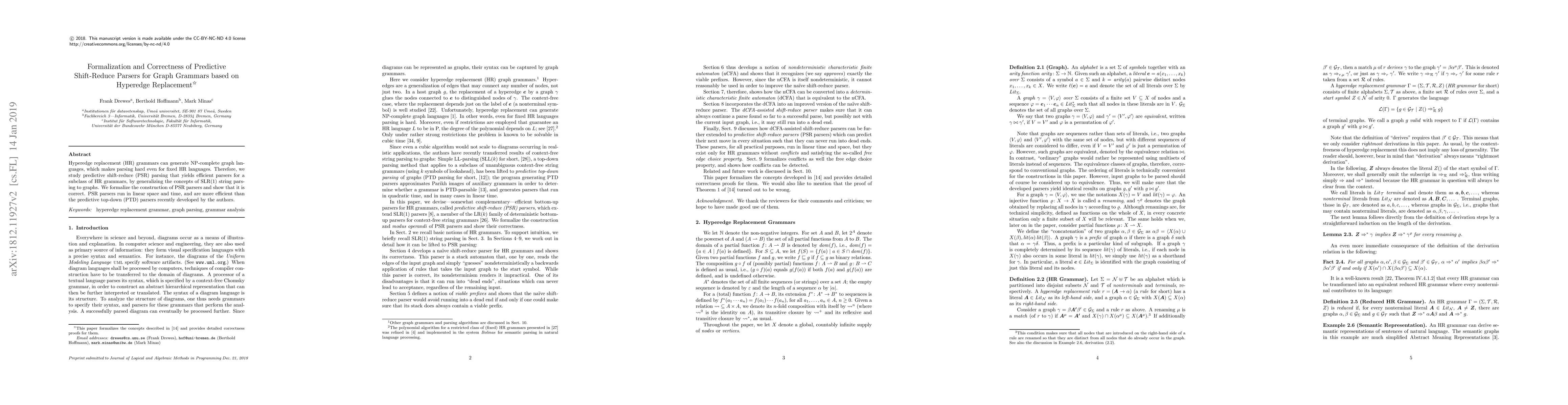 This paper formalizes predictive shift-reduce (PSR) parsing for hyperedge replacement grammars, demonstrating its correctness and efficiency. PSR parsers outperform predictive top-down parsers, running in linear time and space for a subclass of NP-complete graph languages.