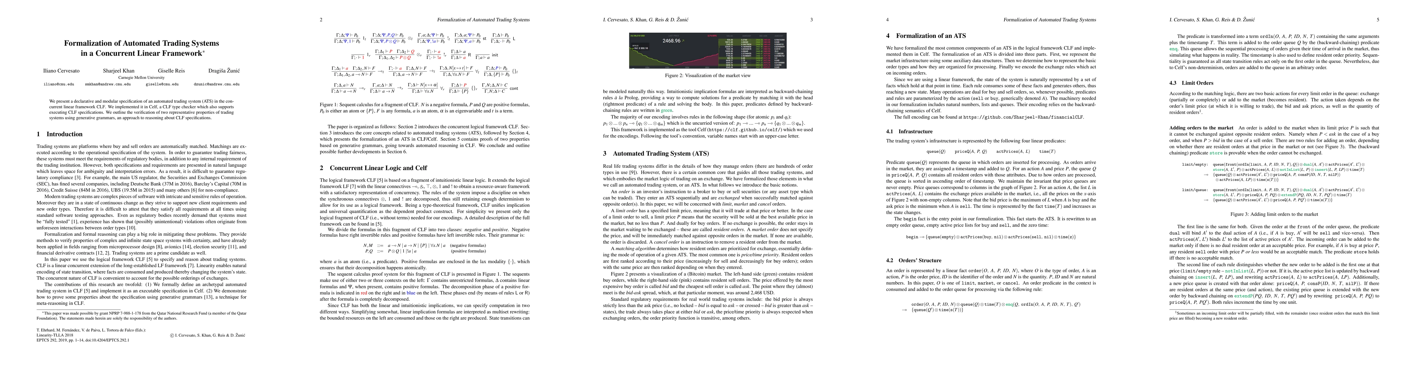 This paper proposes a modular specification of automated trading systems within the concurrent linear framework CLF, implemented in Celf. It verifies key properties using generative grammars and demonstrates reasoning about CLF specifications.