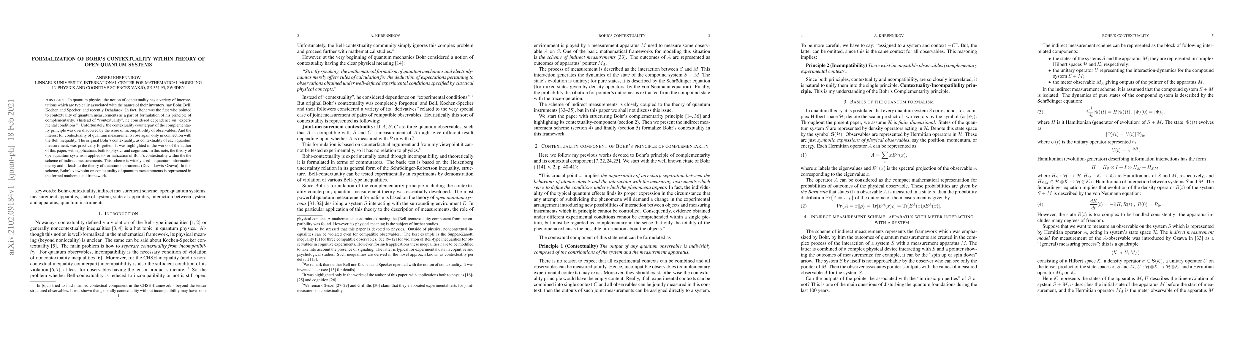 In quantum physics, the notion of contextuality has a variety of interpretations which are typically associated with the names of their inventors, say Bohr, Bell, Kochen and Specker, and recently Dzhafarov. In fact, Bohr was the first who pointed to contextuality of quantum measurements as a part of formulation of his principle of complementarity. (Instead of "contextuality", he considered dependence on "experimental conditions.") Unfortunately, the contextuality counterpart of the complementarity principle was overshadowed by the issue of incompatibility of observables. And the interest for contextuality of quantum measurements rose again only in connection with the Bell inequality. The original Bohr's contextuality, as contextuality of each quantum measurement, was practically forgotten. It was highlighted in the works of the author of this paper, with applications both to physics and cognition. In this note, the theory of open quantum systems is applied to formalization of Bohr's contextuality within the the scheme of indirect measurements. This scheme is widely used in quantum information theory and it leads to the theory of quantum instruments (Davis-Lewis-Ozawa). In this scheme, Bohr's viewpoint on contextuality of quantum measurements is represented in the formal mathematical framework.