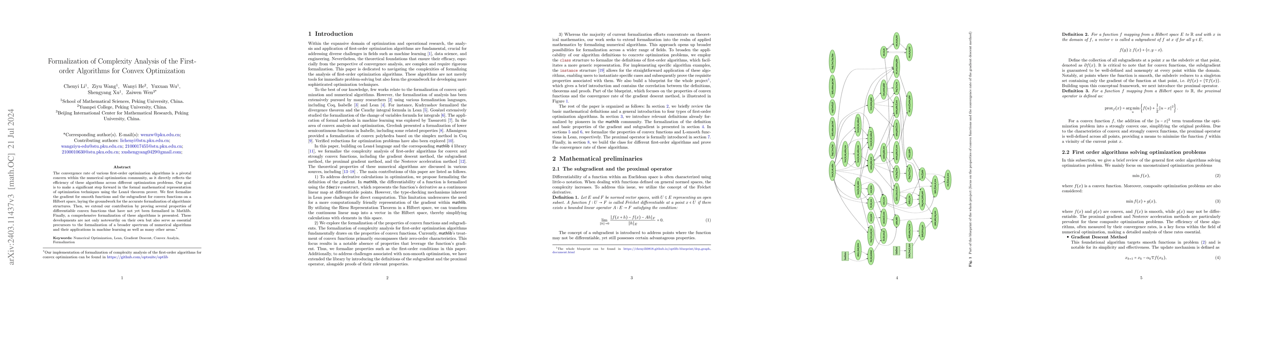 This research formalizes the complexity analysis of first-order optimization algorithms using the Lean4 theorem prover, focusing on gradient and subgradient properties for smooth and convex functions, respectively. It also proves new properties for differentiable convex functions and provides a comprehensive formalization of these algorithms, paving the way for broader numerical and machine learning applications.