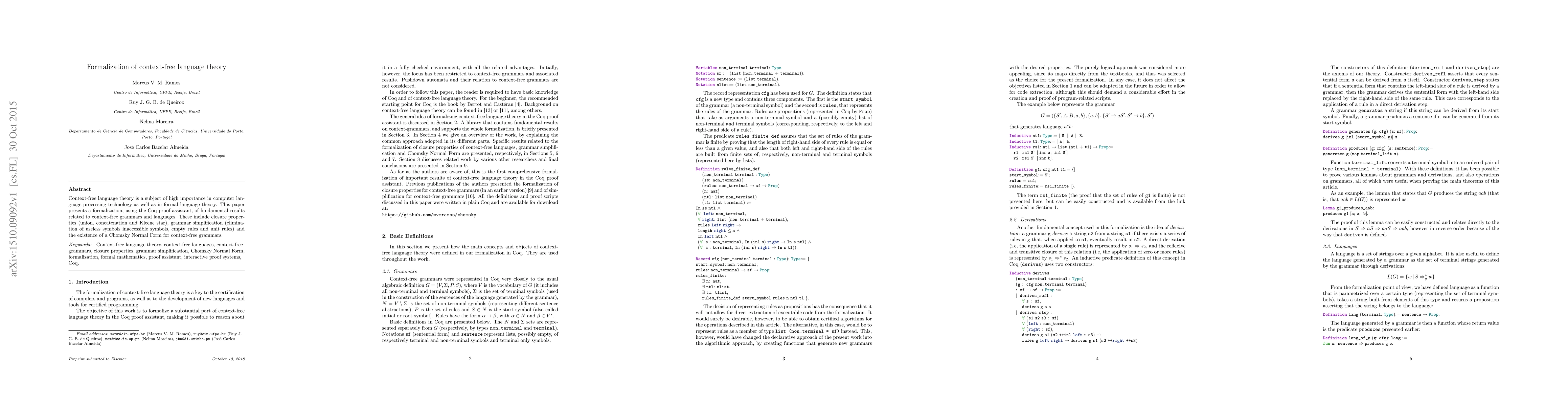 This paper formalizes key results in context-free language theory using the Coq proof assistant, focusing on closure properties, grammar simplification techniques, and the existence of a Chomsky Normal Form for context-free grammars.